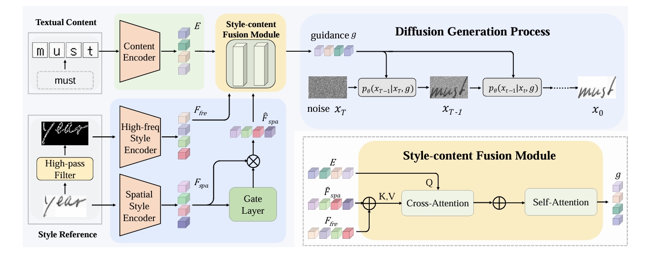 - 以往的最先进方法由于学习风格的能力有限,难以从单个样本中准确提取用户的书写风格。为解决这一问题,我们引入了参考样本的高频成分来增强书写风格的提取。所提出的风格增强模块能够有效捕捉书写风格模式,并抑制背景噪声的干扰。