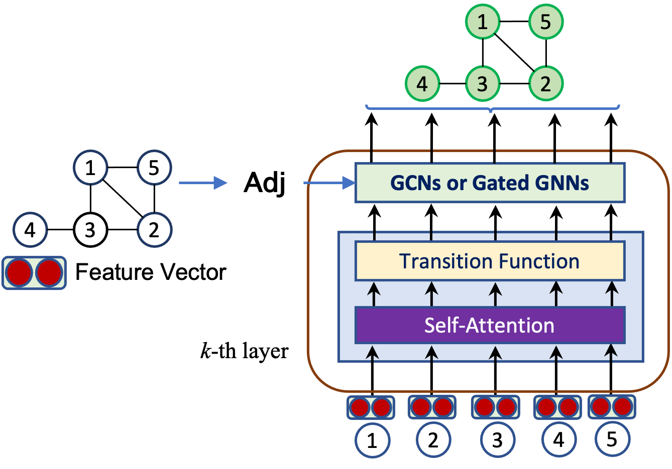 - 局部信息受限:传统图神经网络(如 GCN)只能聚合邻近节点的信息,难以捕捉分子中长距离原子间的相互作用,导致对复杂官能团的特征提取不完整。