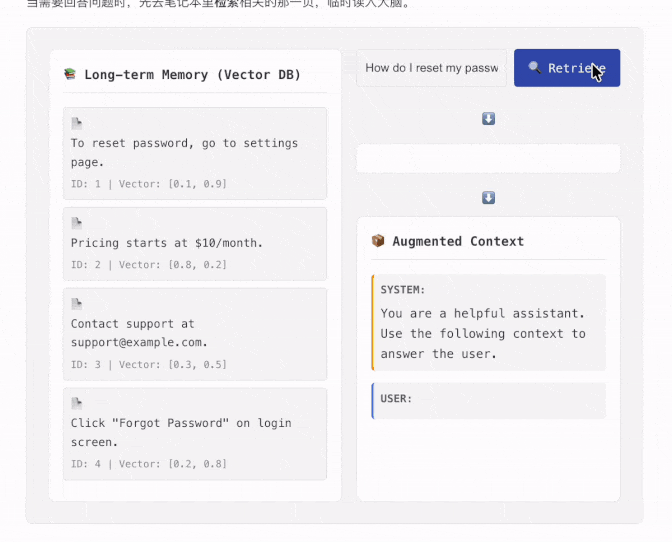 像玩游戏一样学习 RAG 通过交互式组件,你可以一步步点击并了解完整的 RAG 数据流 |