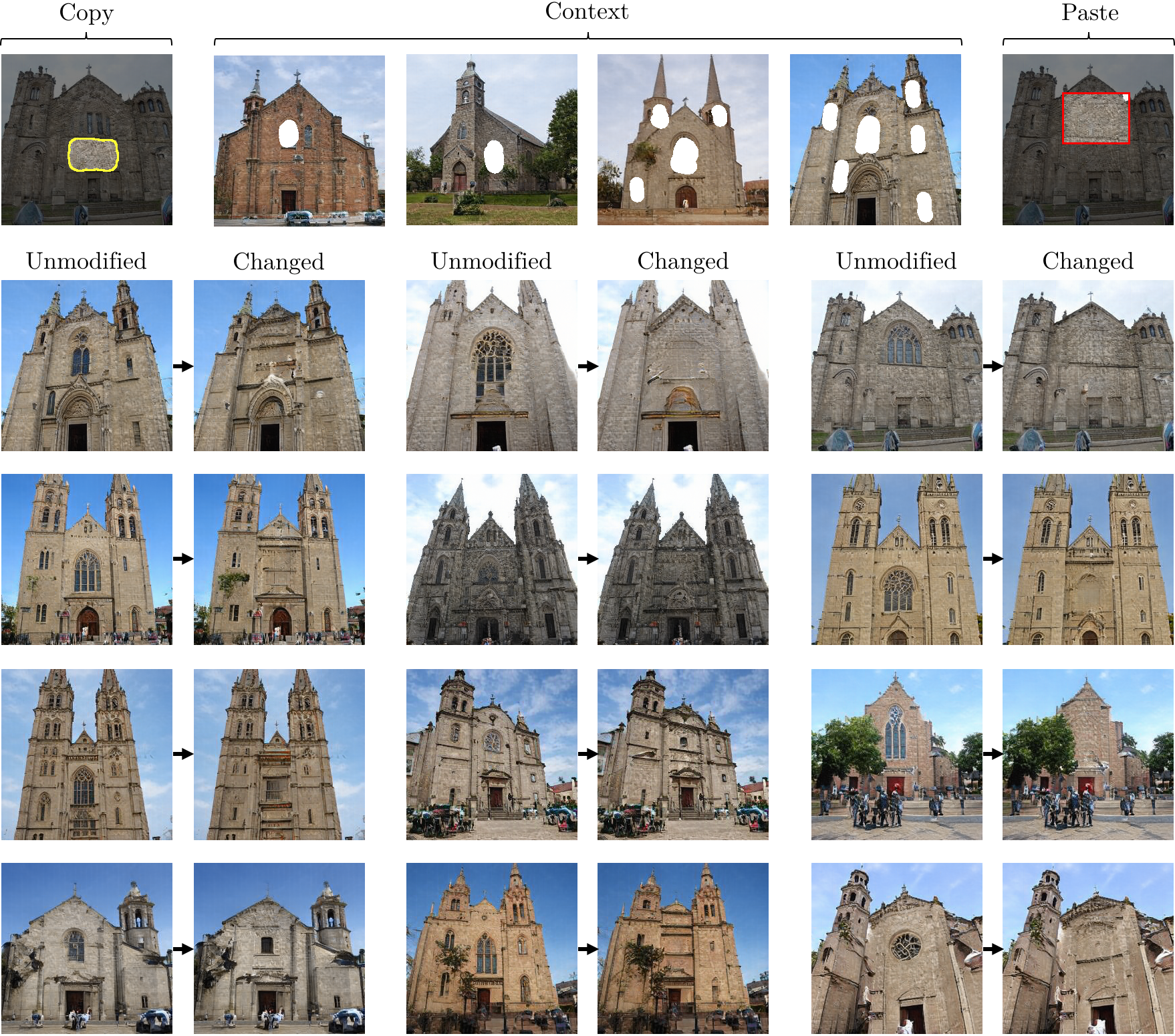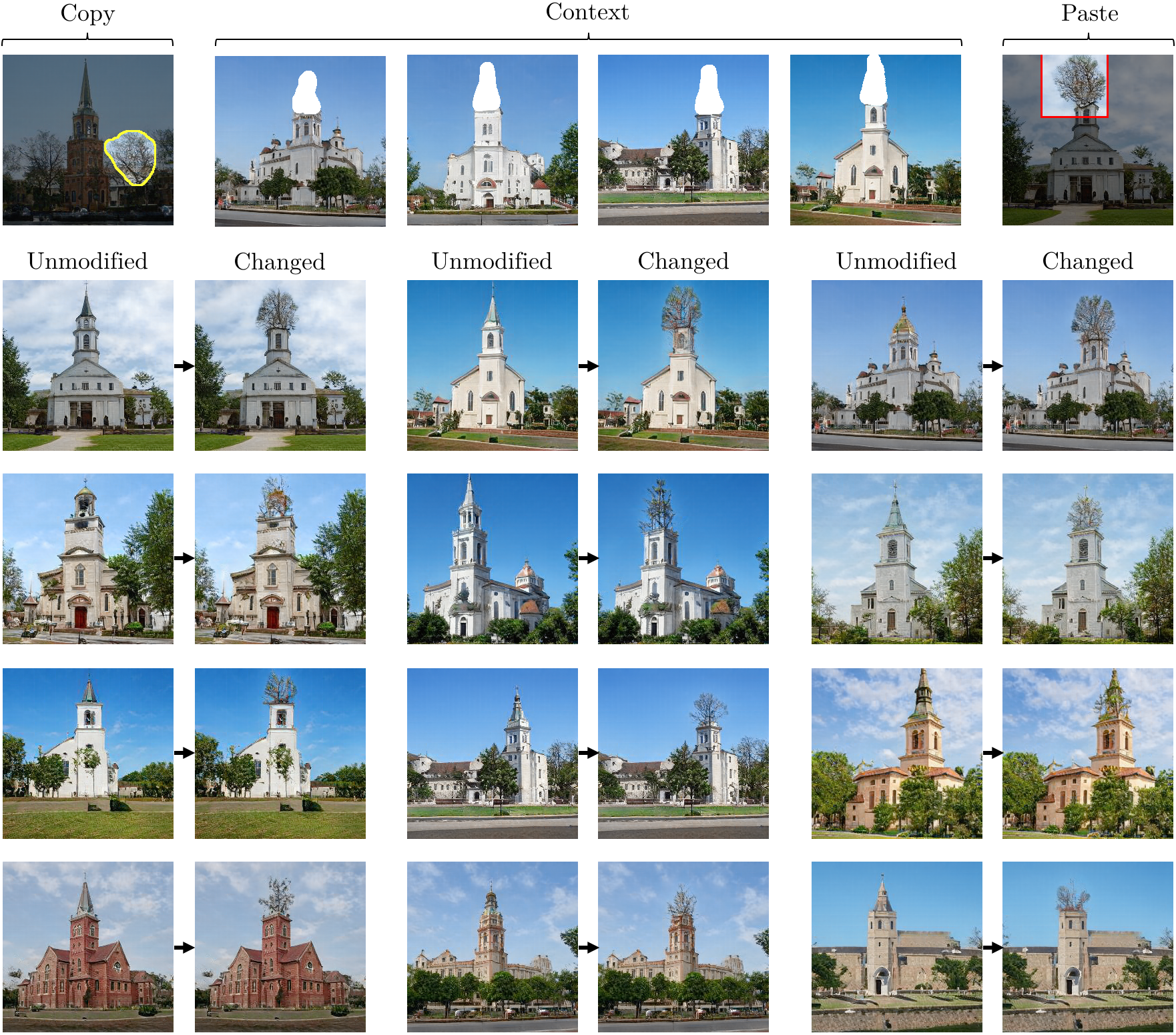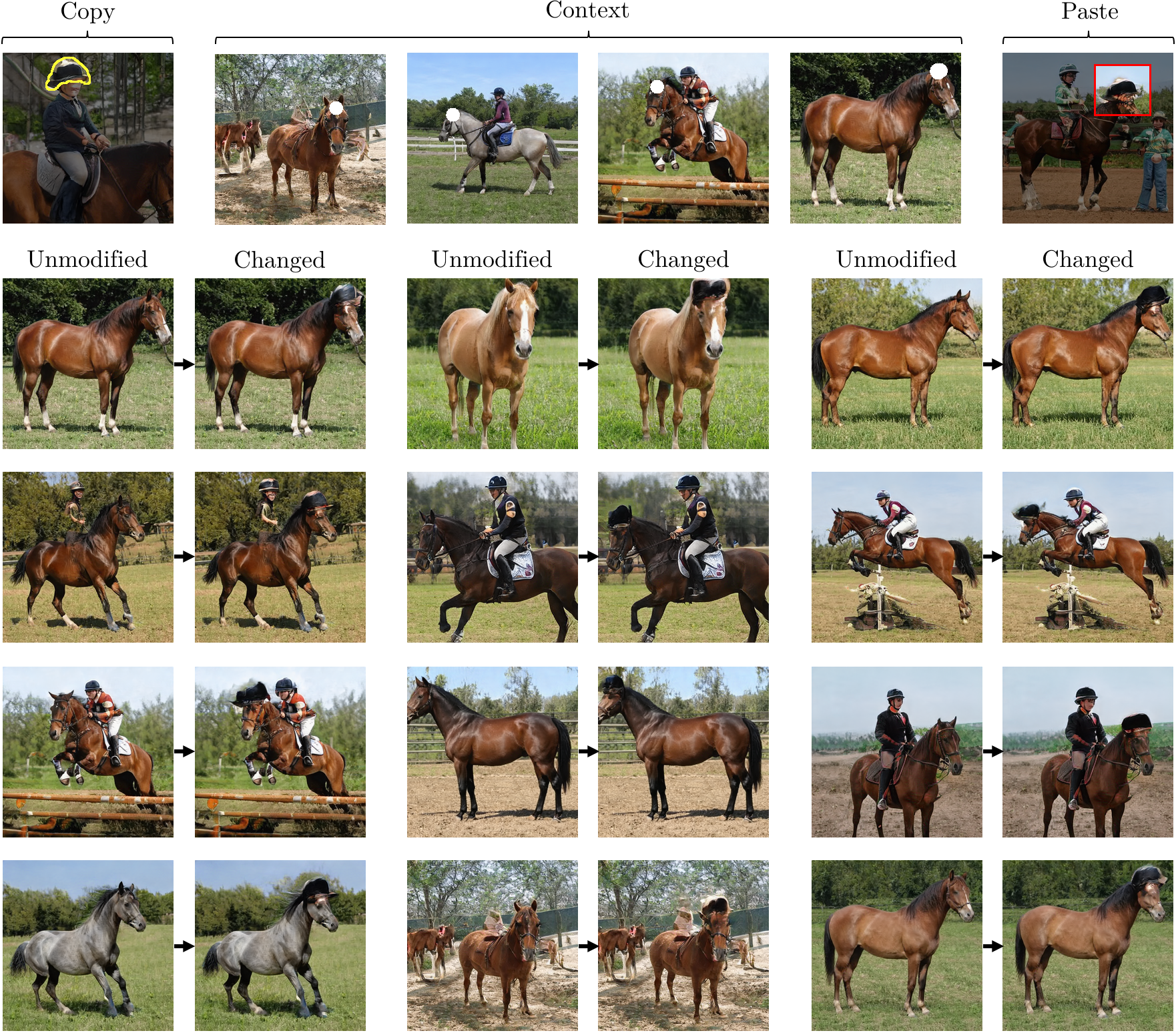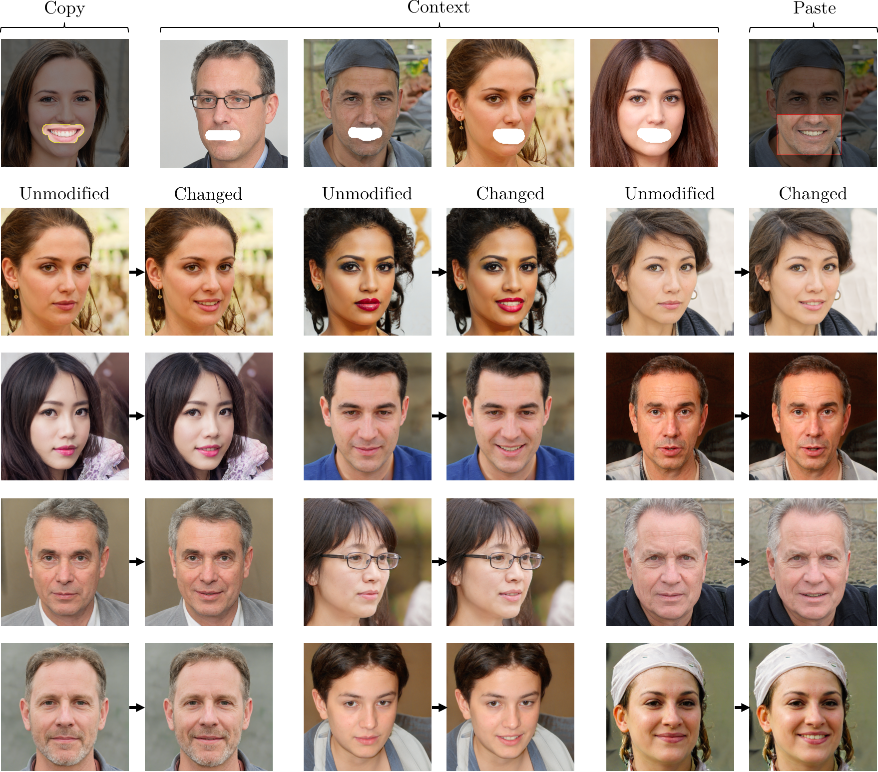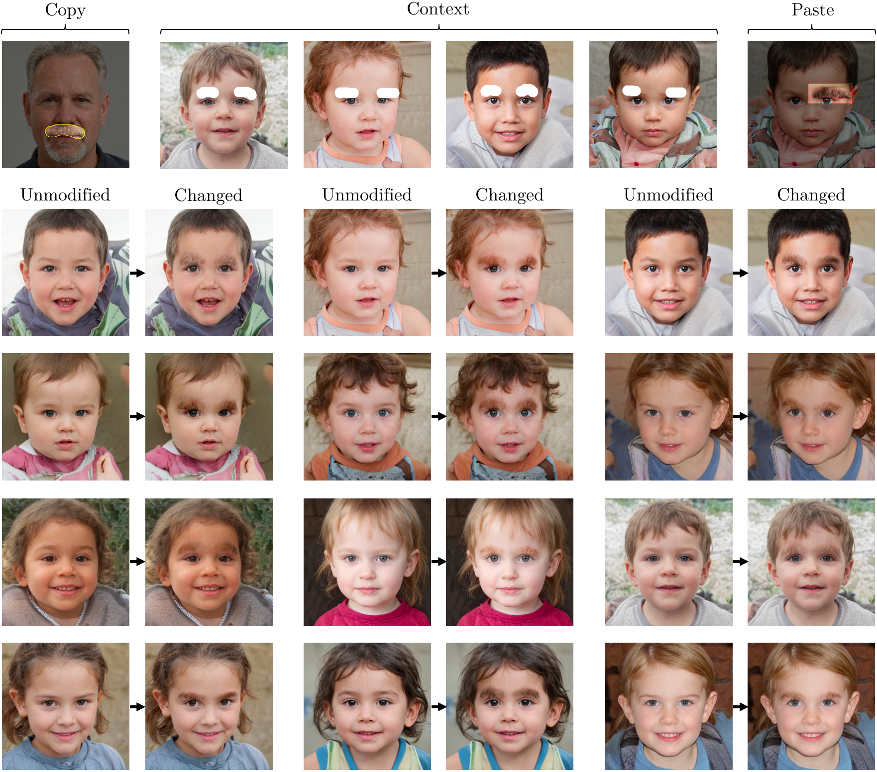 以下结果展示了对StyleGANv2中单一规则的修改。在每种情况下, 由用户选择的四个示例(顶部行中央)确立了要被重写的规则的上下文, 而“复制并粘贴”的示例(顶部行左右两侧)则表明了用户希望如何改变模型。