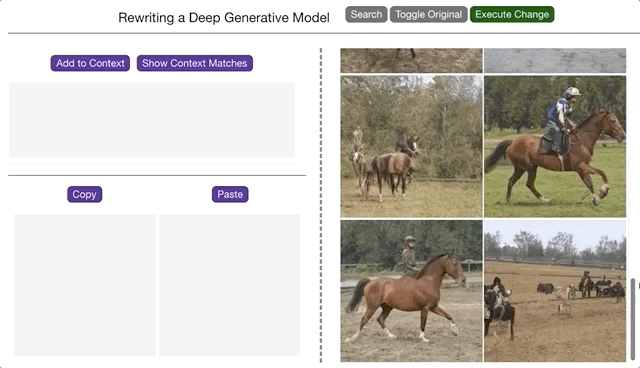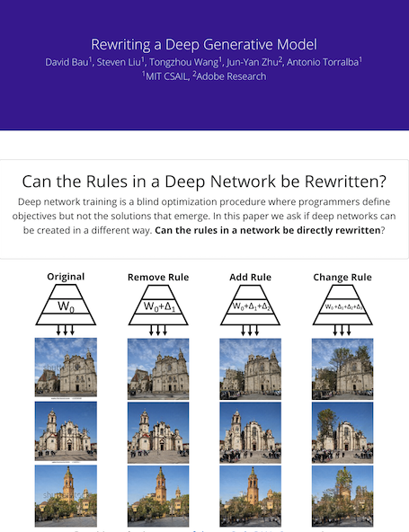 我们提出了模型重写的任务,其目标是添加、移除以及改变预训练深度网络的语义和物理规则。虽然现代图像编辑工具通过操作单个输入图像来实现用户指定的目标,但我们允许用户通过编辑生成模型使其遵循修改后的规则,从而合成无限数量的新图像。