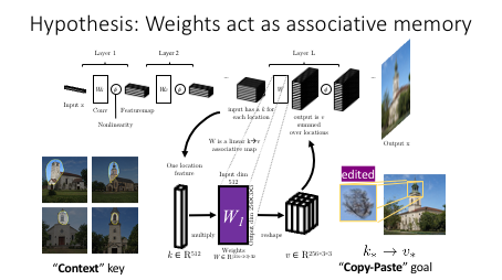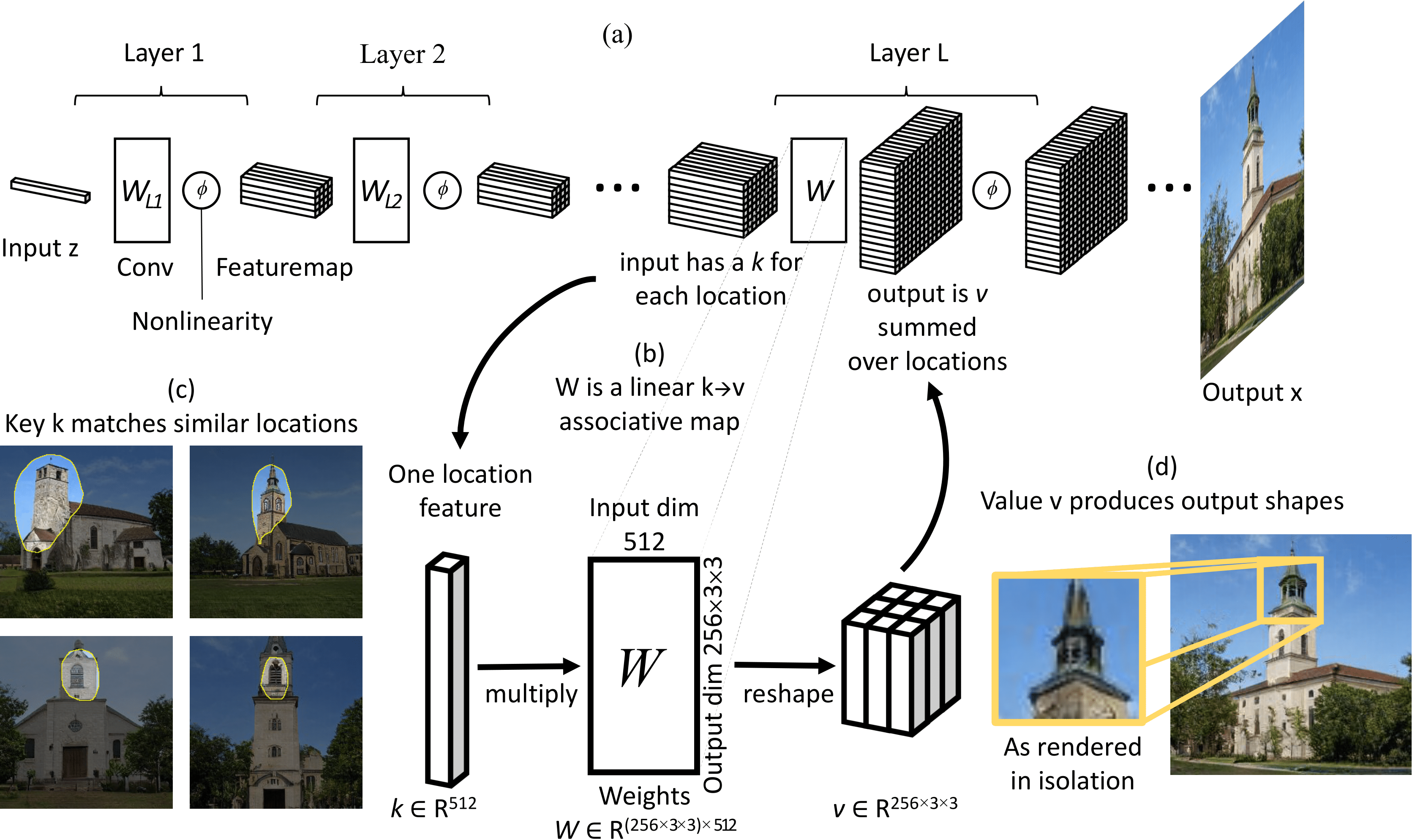 我们的方法基于这样一个假设:生成器的权重充当线性联想记忆。每一层存储着键与值之间的映射关系,其中键表示有意义的上下文,而值则决定输出。