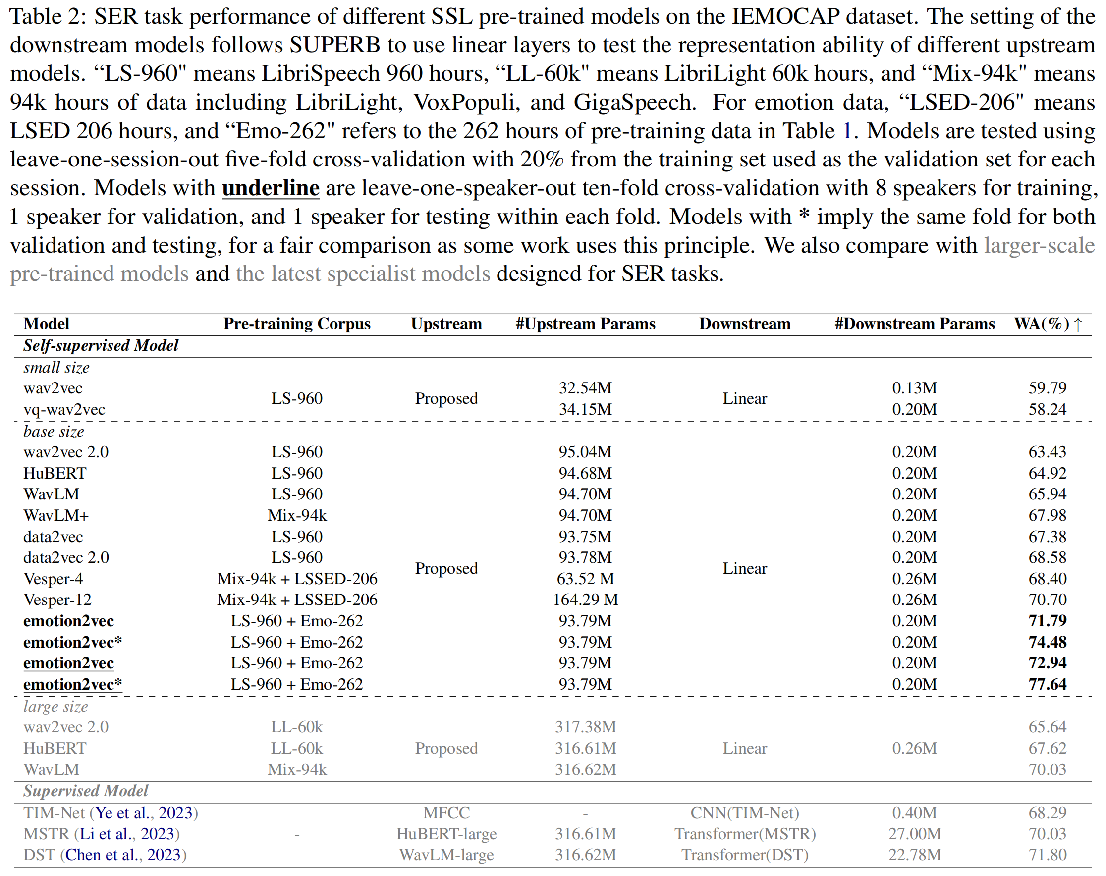 在主流的 IEMOCAP 数据集上,emotion2vec 仅使用线性层即达到了 SOTA 水平。更多细节请参阅论文。