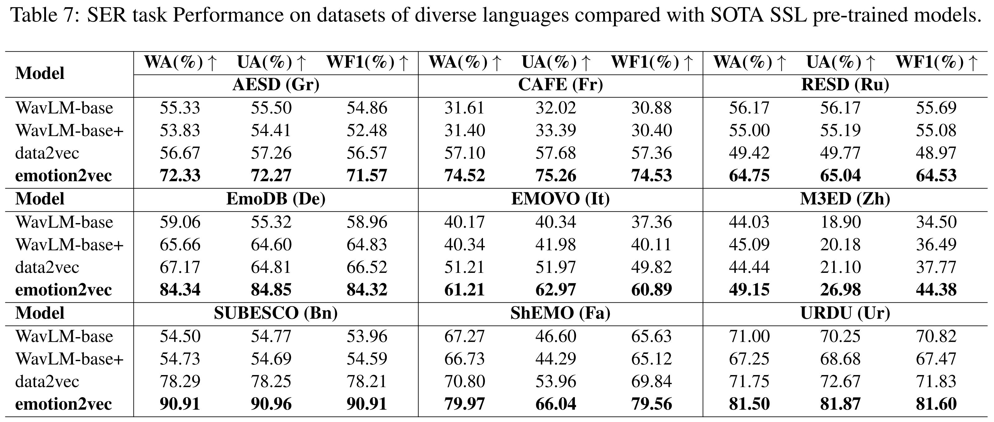 与多个语言(普通话、法语、德语、意大利语等)中的 SOTA SSL 模型相比,emotion2vec 同样达到了 SOTA 水平。更多细节请参阅论文。