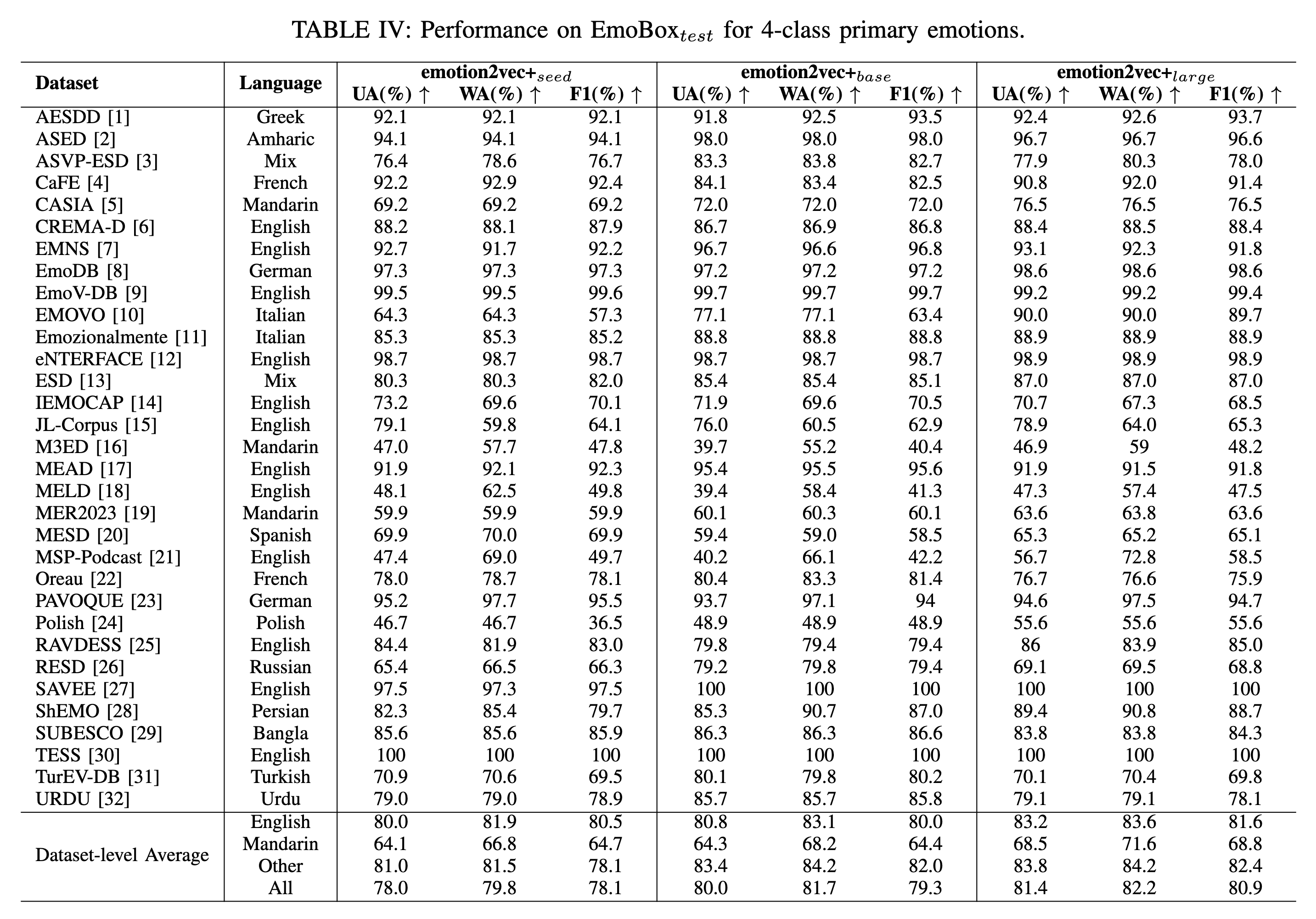 在 EmoBox 数据集上对4类主要情感的表现(未进行微调)。模型性能的详细信息将在稍后公布。