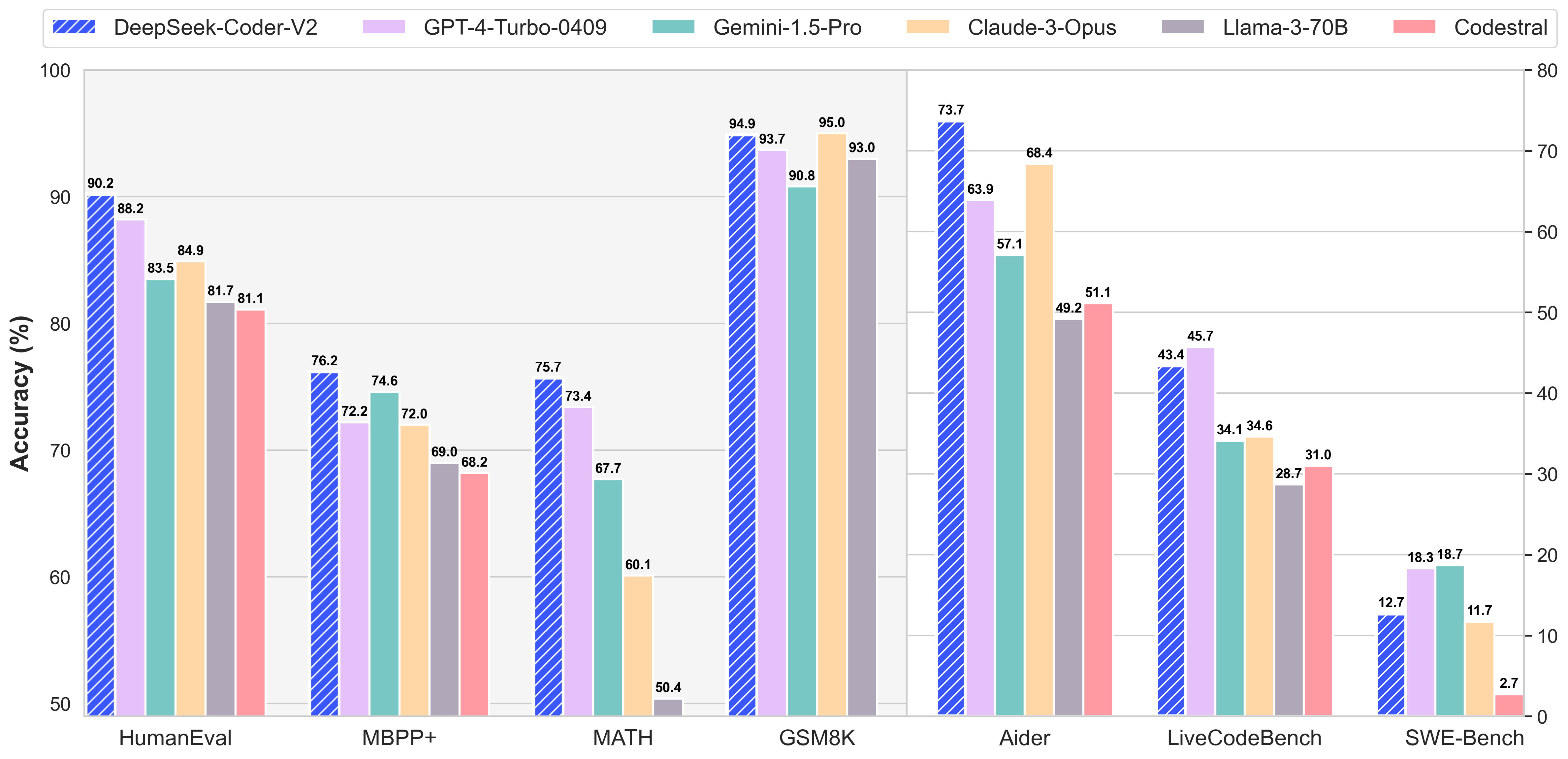 | DeepSeek-Coder-V2-Instruct | 236B | 21B | 90.2 | 76.2 | 43.4 | 12.1 |