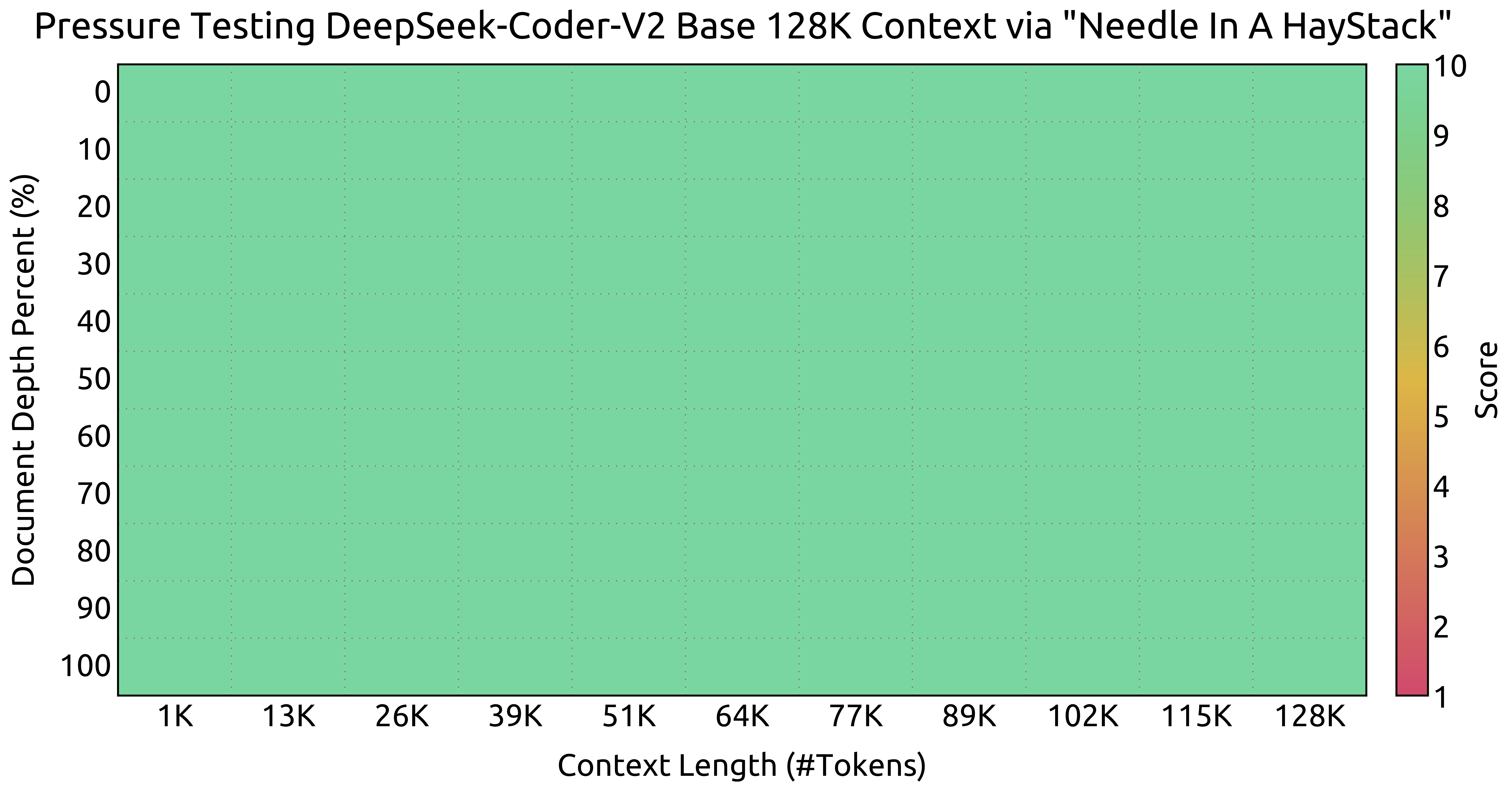 在“Needle In A Haystack”(NIAH)测试中的评估结果。DeepSeek-Coder-V2 在所有上下文窗口长度上表现良好,最高可达 128K。
