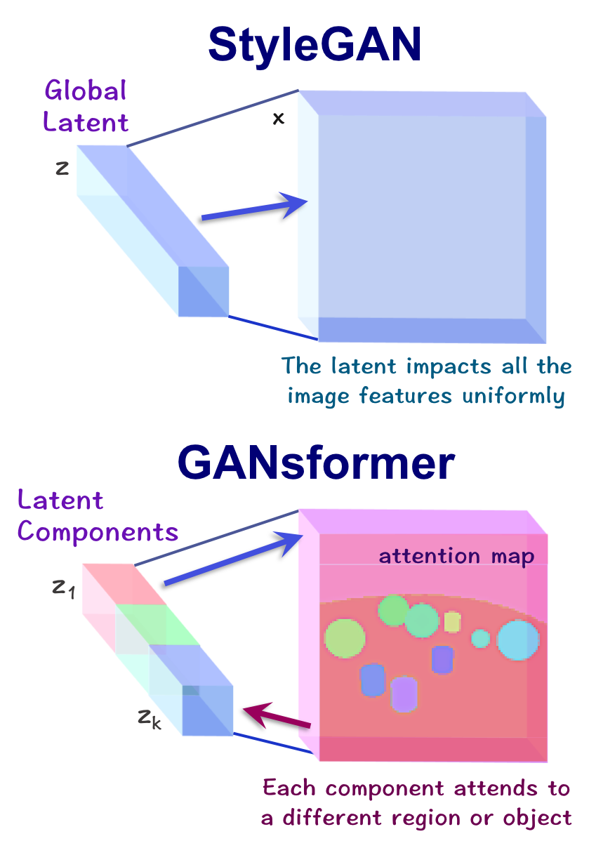 GANformer 模型也可以被视为 StyleGAN 的一种泛化:StyleGAN 只有一个全局潜在向量来全局控制所有图像特征的风格,而 GANformer 则拥有 k 个潜在向量,它们通过注意力机制协作控制图像中的不同区域,从而更好地建模多物体和组合场景的图像。