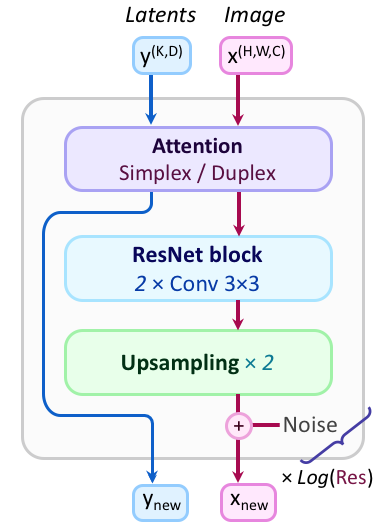 k个潜在组件之外增加一个全局潜在变量 (--style)。首先由全局潜在变量统一调节图像的所有特征,然后由k个潜在变量根据二分图变换器的注意力机制分别调节不同区域。