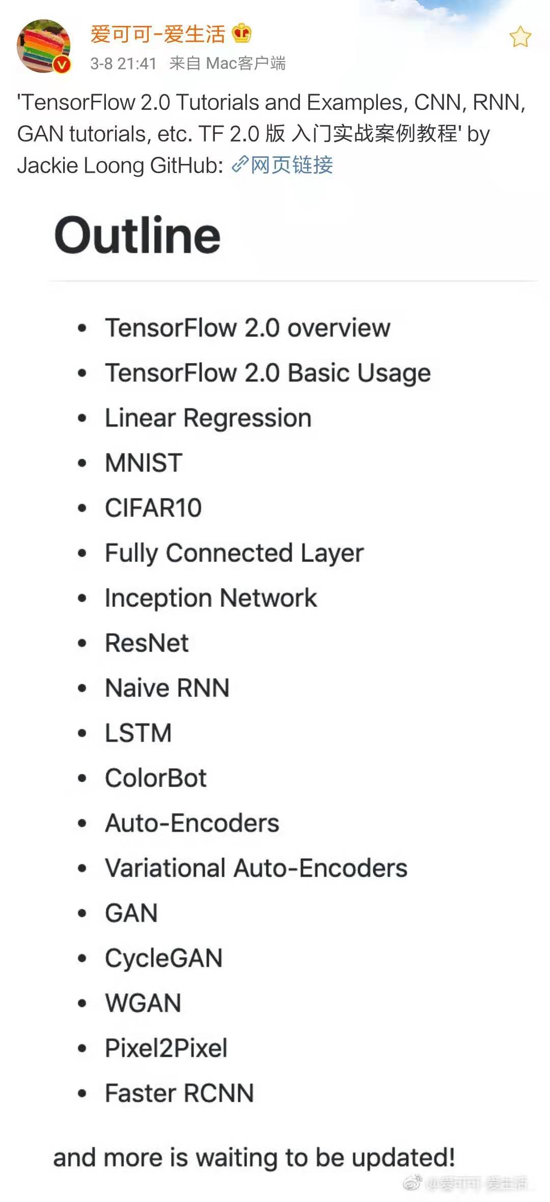 无论是刚接触人工智能的学生、希望提升工程能力的开发者,还是需要进行算法验证的研究人员,都能从中获益。内容覆盖极其广泛,不仅包含线性回归、MNIST 分类等基础入门案例,还深入涵盖了 VGG、ResNet 等经典卷积网络,LSTM、RNN 等序列模型,以及 GAN、BERT、GPT、FasterRCNN 等前沿生成式与检测模型。其独特亮点在于紧密跟随 TensorFlow 2.0 的发布节奏,全面采用更简洁的 Eager Execution(即时执行)模式编写,并曾荣获官方"#PoweredByTF 2.0"挑战赛优胜奖。此外,项目还配套了系统的中文视频教程,让学习过程更加直观高效,是通往深度学习实战之路的优质指南。