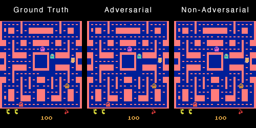 此示例展示了对抗网络如何在多次转弯中保持 Ms. Pac-Man 的清晰表示,而非对抗网络则无法做到这一点: