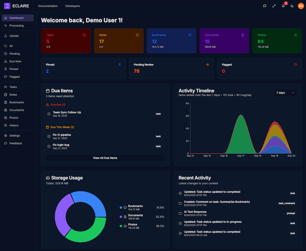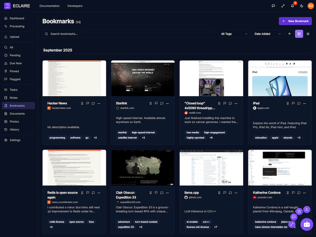 Eclaire 是一个以本地优先(local-first)、开源的 AI 系统,可跨任务、笔记、文档、照片、书签等组织信息、回答问题并实现自动化。