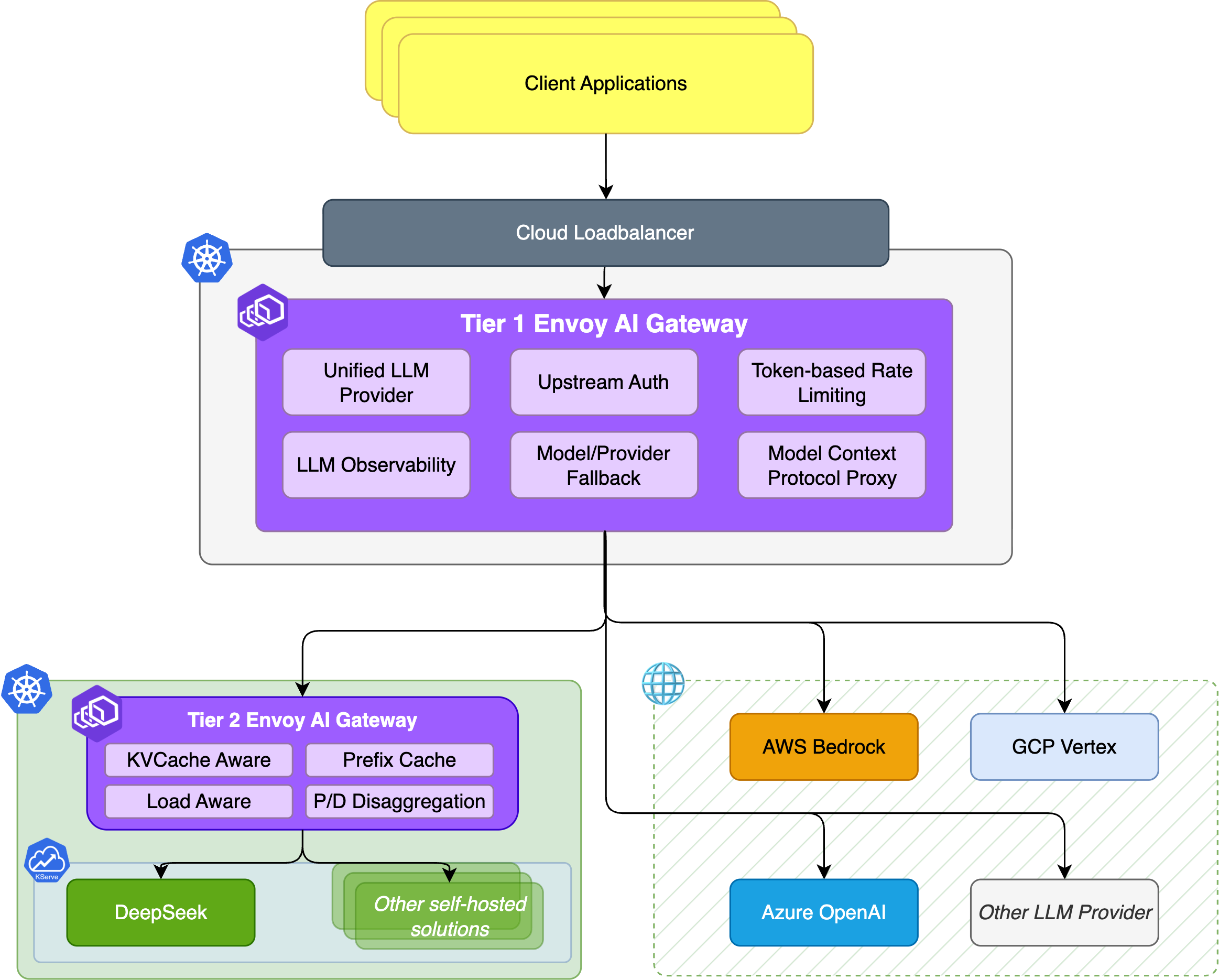 - 精细化流控:通过全局速率限制保护预算,同时利用 Tier Two 网关对自托管集群进行细粒度负载均衡,确保推理服务高可用。
