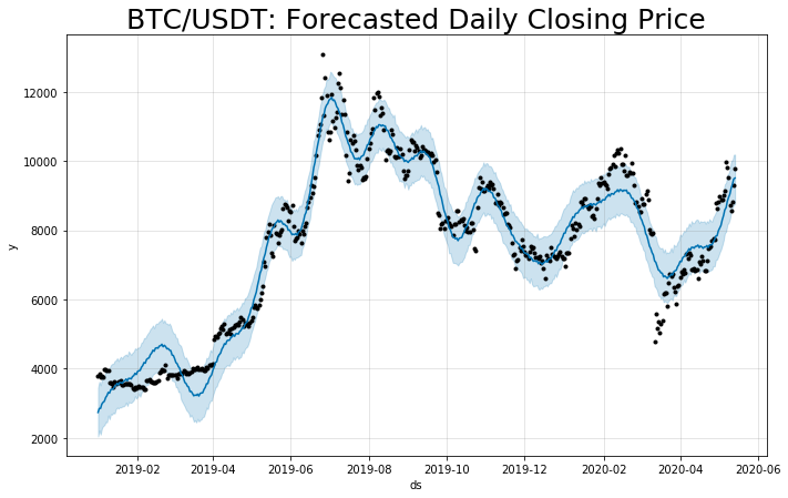 plt.title('BTC/USDT: 预测的每日收盘价', fontsize=25)