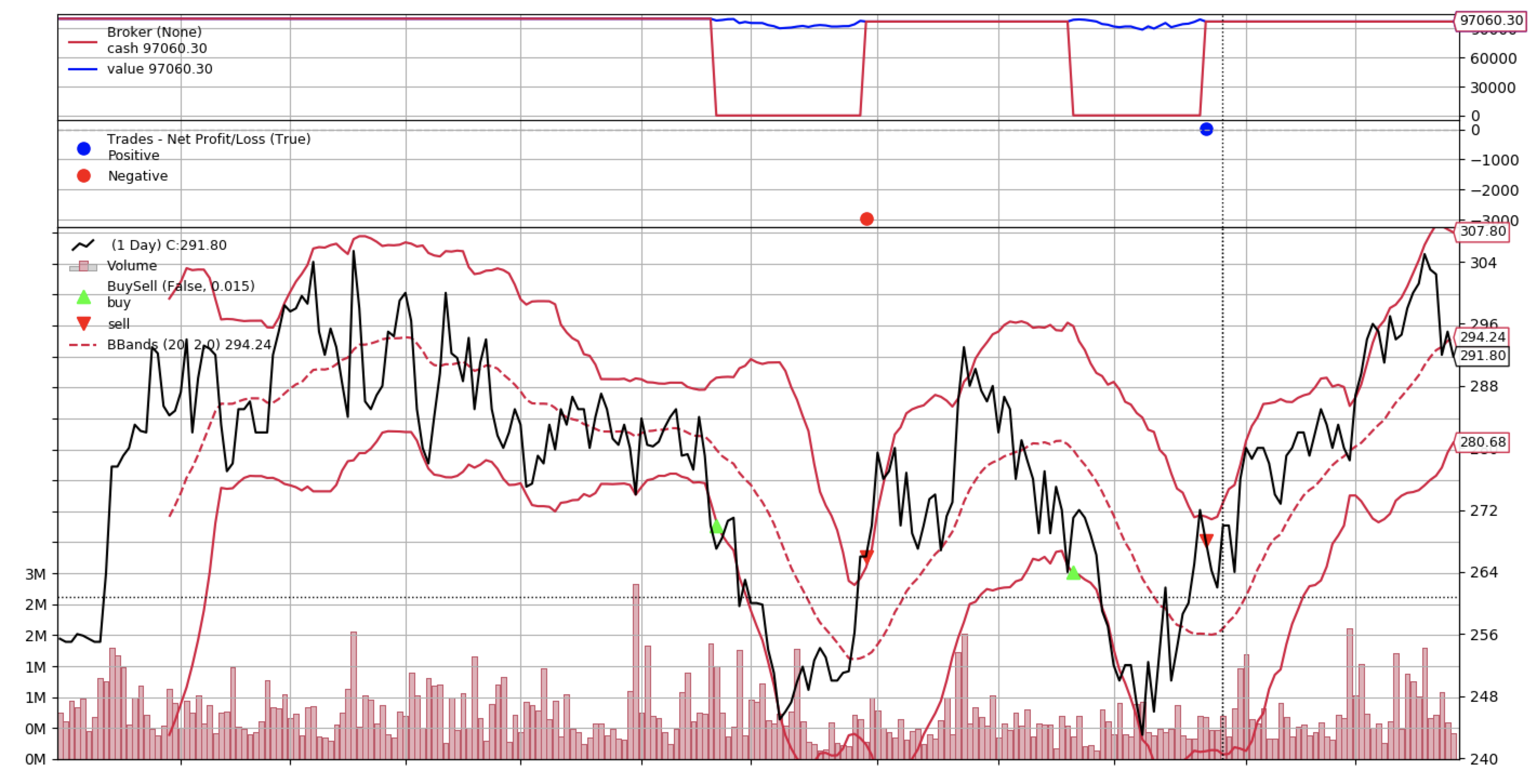 backtest('bbands', df, period=20, devfactor=2.0)