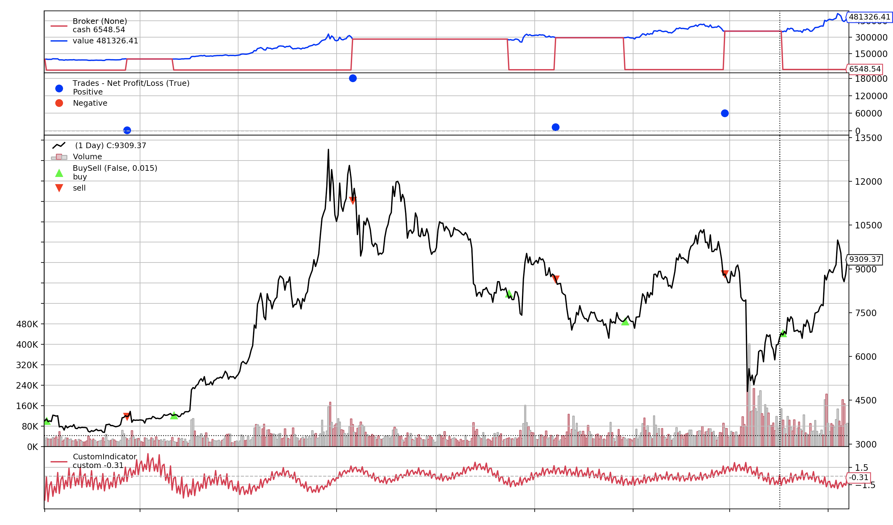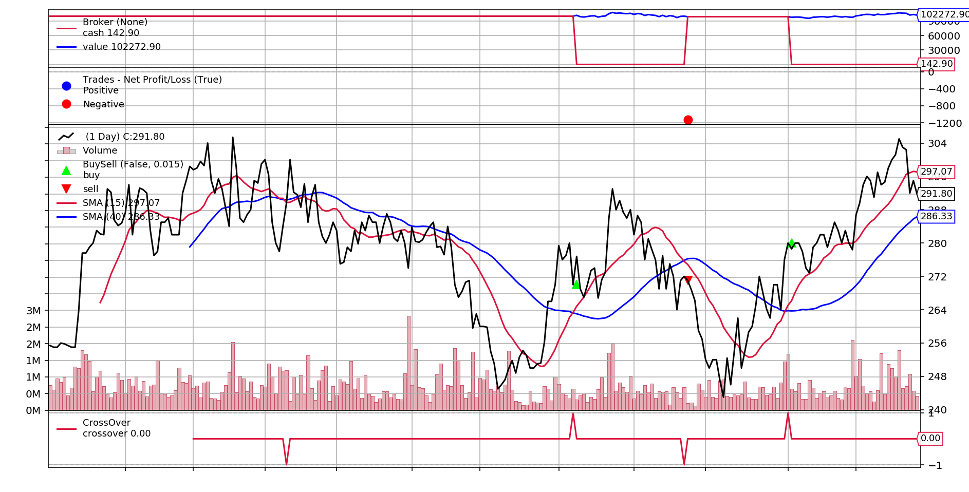 # 最优指标:{'rtot': 0.022, 'ravg': 9.25e-05, 'rnorm': 0.024, 'rnorm100': 2.36, 'sharperatio': None, 'pnl': 2272.9, 'final_value': 102272.90}