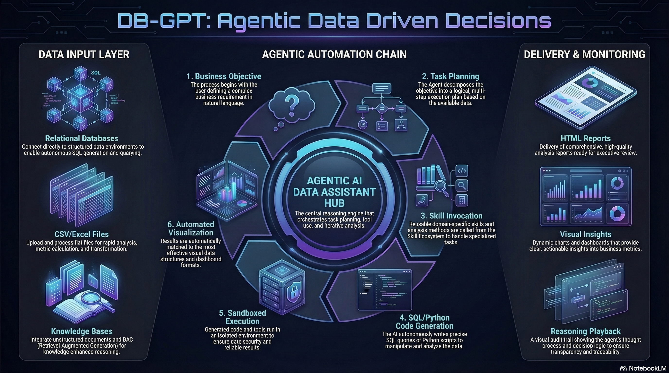 DB-GPT 是一款开源的代理式 AI 数据助手,旨在成为下一代"AI+ 数据”产品的核心引擎。它打破了传统数据分析的门槛,让用户能够直接连接数据库、数据仓库、CSV/Excel 文件及知识库,只需使用自然语言提问,AI 即可自动编写并执行 SQL 查询或 Python 代码,将复杂的数据分析转化为直观的图表、仪表盘和深度洞察报告。