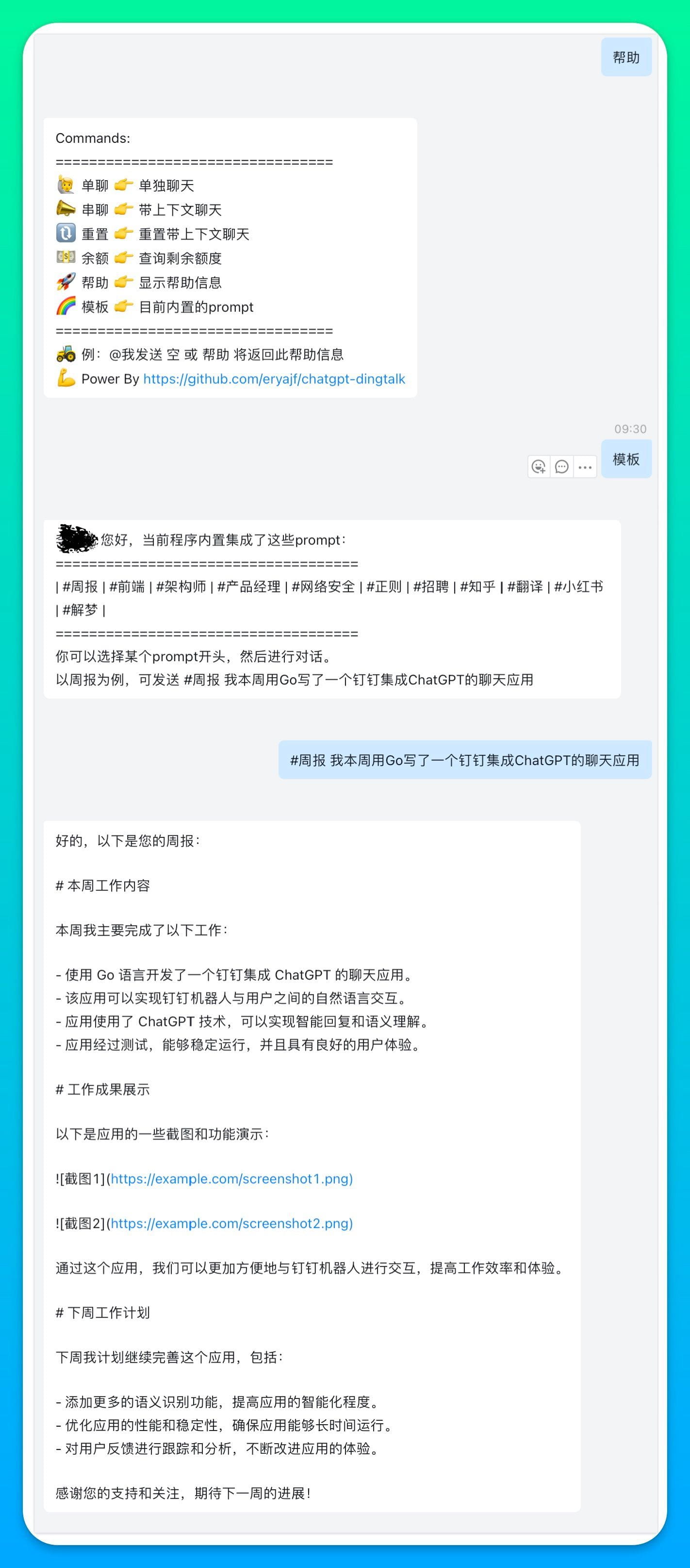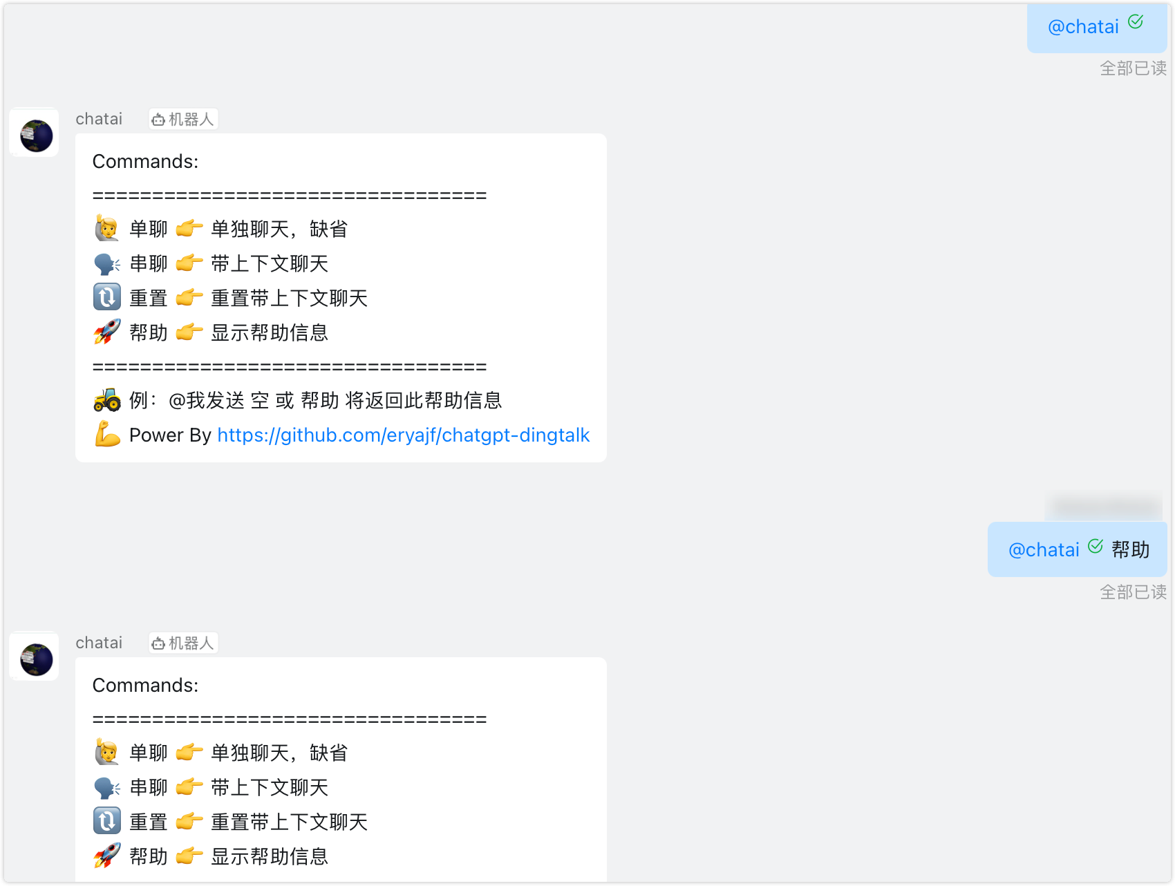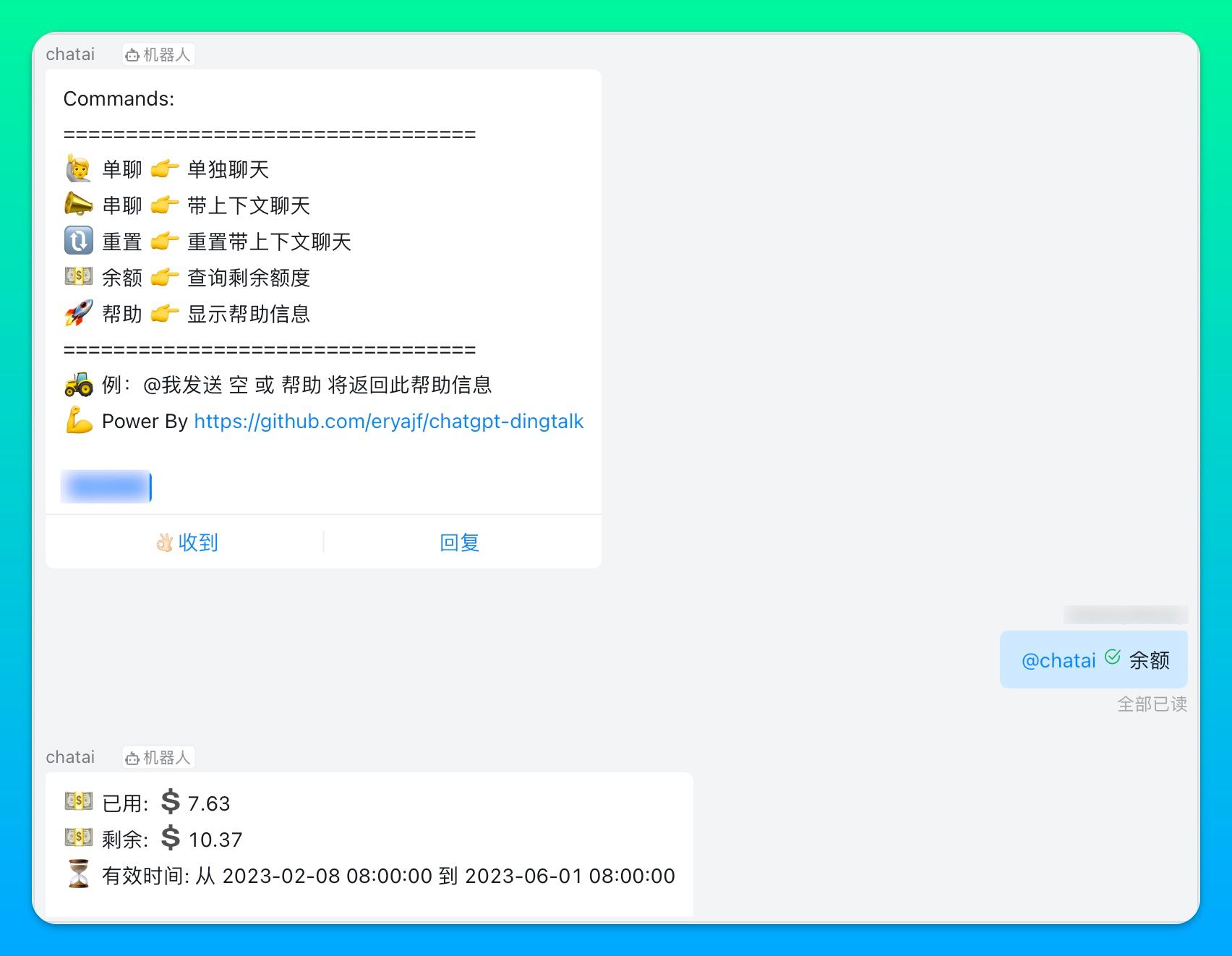 help: "### 发送信息\n\n若您想给机器人发送信息,有如下两种方式:\n\n1. **群聊:** 在机器人所在群里 **@机器人** 后边跟着要提问的内容。\n\n2. **私聊:** 点击机器人的 **头像** 后,再点击 **发消息。** \n\n### 系统指令\n\n系统指令是一些特殊的词语,当您向机器人发送这些词语时,会触发对应的功能。\n\n**📢 注意:系统指令,即只发指令,没有特殊标识,也没有内容。**\n\n以下是系统指令详情:\n\n| 指令 | 描述 | 示例 |\n| :--------: | :------------------------------------------: | :----------------------------------------------------------: |\n| **单聊** | 每次对话都是一次新的对话,没有聊天上下文联系 | <details><br /><summary>预览</summary><br /><img src='https://oss.gittoolsai.com/images/eryajf_chatgpt-dingtalk_readme_7b281c4a7003.jpg'><br /></details> |\n| **串聊** | 带上下文联系的对话模式 | <details><br /><summary>预览</summary><br /><img src='https://oss.gittoolsai.com/images/eryajf_chatgpt-dingtalk_readme_35bbc7f76d44.jpg'><br /></details> |\n| **重置** | 重置上下文模式,回归到默认模式 | <details><br /><summary>预览</summary><br /><img src='https://oss.gittoolsai.com/images/eryajf_chatgpt-dingtalk_readme_942f5e990aa9.jpg'><br /></details> |\n| **余额** | 查询机器人所用OpenAI账号的余额 | <details><br /><summary>预览</summary><br /><img src='https://oss.gittoolsai.com/images/eryajf_chatgpt-dingtalk_readme_2f672a902f3a.jpg'><br /></details> |\n| **模板** | 查看应用内置的prompt模板 | <details><br /><summary>预览</summary><br /><img src='https://oss.gittoolsai.com/images/eryajf_chatgpt-dingtalk_readme_1ddead0c254b.jpg'><br /></details> |\n| **图片** | 查看如何根据提示生成图片 | <details><br /><summary>预览</summary><br /><img src='https://oss.gittoolsai.com/images/eryajf_chatgpt-dingtalk_readme_1ddead0c254b.jpg'><br /></details> |\n| **查对话** | 获取指定人员的对话历史 | <details><br /><summary>预览</summary><br /><img src='https://oss.gittoolsai.com/images/eryajf_chatgpt-dingtalk_readme_942f5e990aa9.jpg'><br /></details> |\n| **帮助** | 获取帮助信息 | <details><br /><summary>预览</summary><br /><img src='https://oss.gittoolsai.com/images/eryajf_chatgpt-dingtalk_readme_2f672a902f3a.jpg'><br /></details> |\n\n\n### 功能指令\n\n除去系统指令,还有一些功能指令,功能指令是直接与应用交互,达到交互目的的一种指令。\n\n**📢 注意:功能指令,一律以 #+关键字 为开头,通常需要在关键字后边加个空格,然后再写描述或参数。**\n\n以下是功能指令详情\n\n| 指令 | 说明 | 示例 |\n| :--: | :--: | :--: |\n| **#图片** | 根据提示咒语生成对应图片 | <details><br /><summary>预览</summary><br /><img src='https://oss.gittoolsai.com/images/eryajf_chatgpt-dingtalk_readme_4f01bf207056.jpg'><br /></details> |\n| **#域名** | 查询域名相关信息 | <details><br /><summary>预览</summary><br /><img src='https://oss.gittoolsai.com/images/eryajf_chatgpt-dingtalk_readme_a4282ea14979.jpg'><br /></details> |\n| **#证书** | 查询域名证书相关信息 | <details><br /><summary>预览</summary><br /><img src='https://oss.gittoolsai.com/images/eryajf_chatgpt-dingtalk_readme_3f55ea694fa5.jpg'><br /></details> |\n| **#Linux命令** | 根据自然语言描述生成对应命令 | <details><br /><summary>预览</summary><br /><img src='https://oss.gittoolsai.com/images/eryajf_chatgpt-dingtalk_readme_e681947f8fbc.jpg'><br /></details> |\n| **#解释代码** | 分析一段代码的功能或含义 | <details><br /><summary>预览</summary><br /><img src='https://oss.gittoolsai.com/images/eryajf_chatgpt-dingtalk_readme_77a04291db07.jpg'><br /></details> |\n| **#正则** | 根据自然语言描述生成正则 | <details><br /><summary>预览</summary><br /><img src='https://oss.gittoolsai.com/images/eryajf_chatgpt-dingtalk_readme_dd4fe29edcca.jpg'><br /></details> |\n| **#周报** | 应用周报的prompt | <details><br /><summary>预览</summary><br /><img src='https://oss.gittoolsai.com/images/eryajf_chatgpt-dingtalk_readme_9c337740c8d3.jpg'><br /></details> |\n| **#生成sql** | 根据自然语言描述生成sql语句 | <details><br /><summary>预览</summary><br /><img src='https://oss.gittoolsai.com/images/eryajf_chatgpt-dingtalk_readme_606870d76626.jpg'><br /></details> |\n\n如上大多数能力,都是依赖prompt模板实现,如果你有更好的prompt,欢迎提交PR.\n\n### 友情提示\n\n使用 **串聊模式** 会显著加快机器人所用账号的余额消耗速度,因此,若无保留上下文的需求,建议使用 **单聊模式。** \n\n即使有保留上下文的需求,也应适时使用 **重置** 指令来重置上下文.\n\n### 项目地址\n\n本项目已在GitHub开源,[查看源代码](https://github.com/eryajf/chatgpt-dingtalk)。"