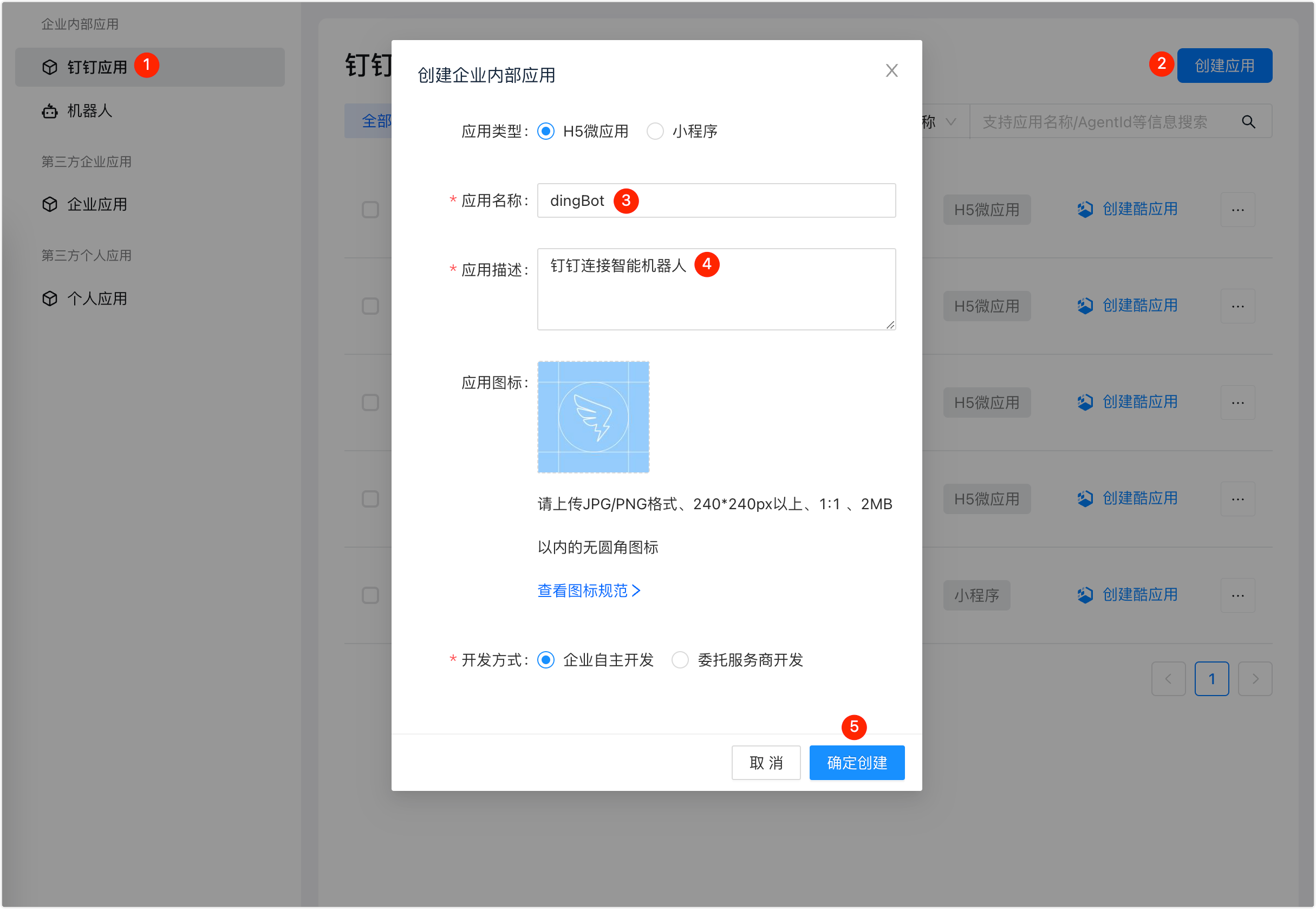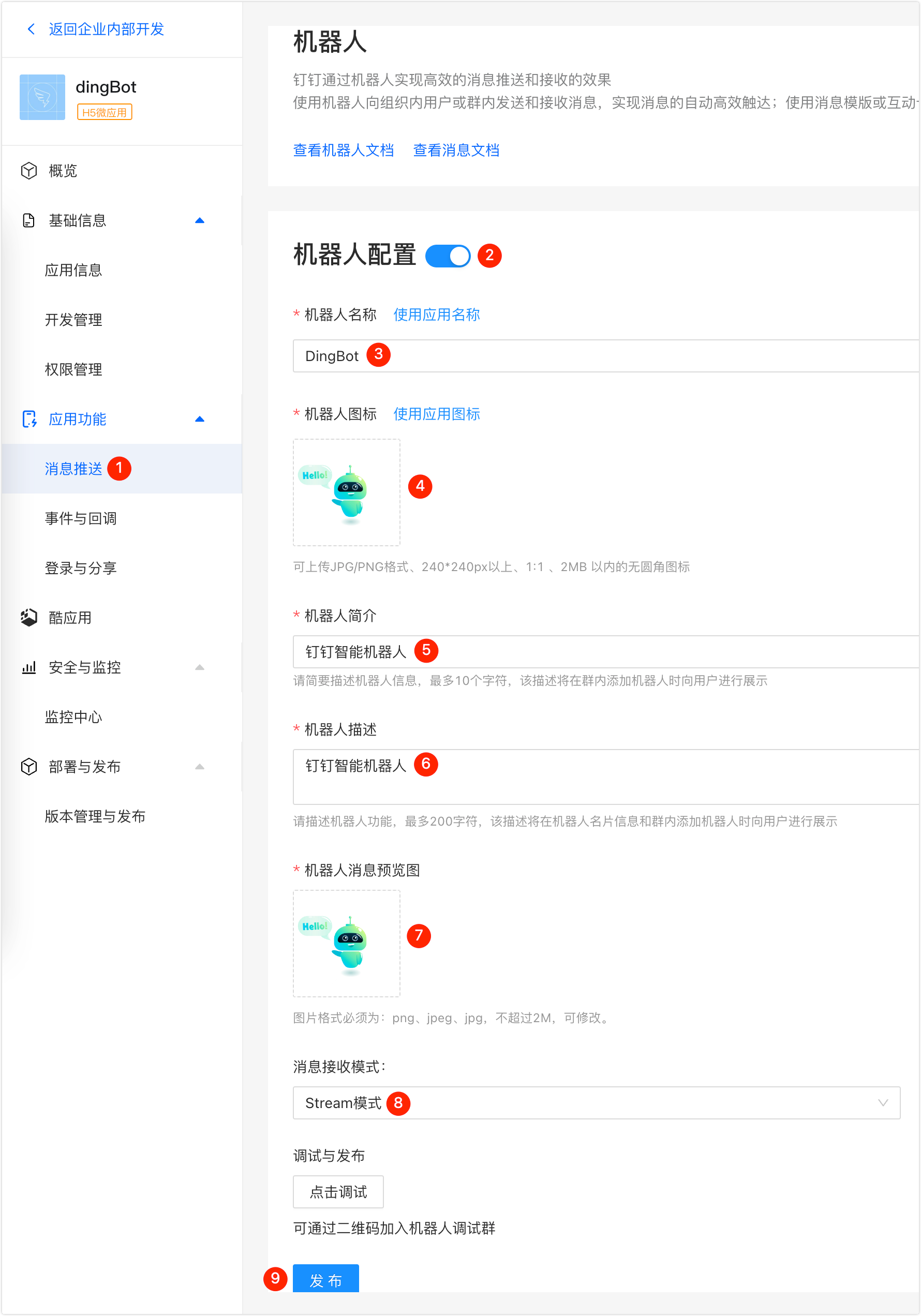 api_key,注册相关事项可以参考此文章 。访问这里,申请个人秘钥。 - 在钉钉开发者后台创建应用,在应用的消息推送功能块添加机器人,将消息接收模式指定为 stream 模式。