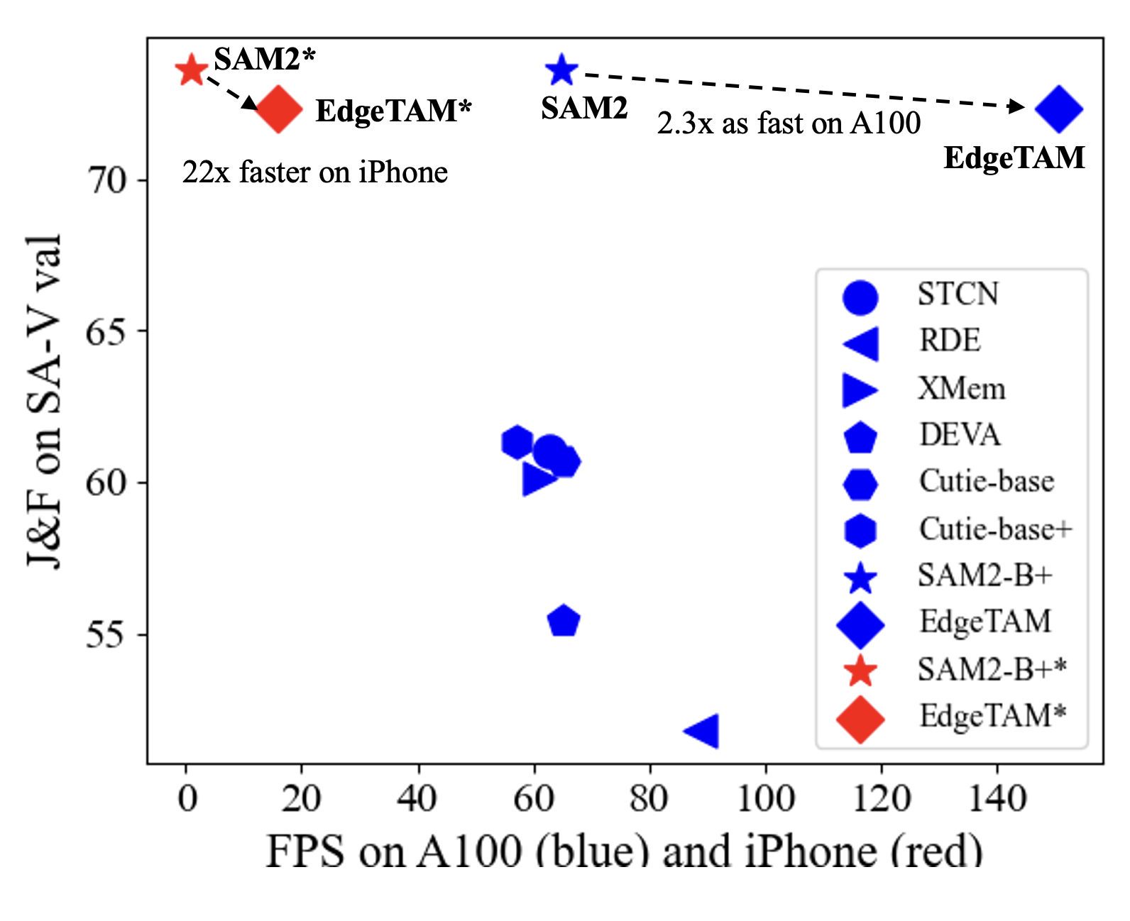 在此图中,我们展示了 EdgeTAM 和其他模型在 iPhone 15 Pro Max(红色)和 NVIDIA A100(蓝色)上的速度与性能权衡。我们以 SA-V 验证集上的 J&F 作为评估指标。