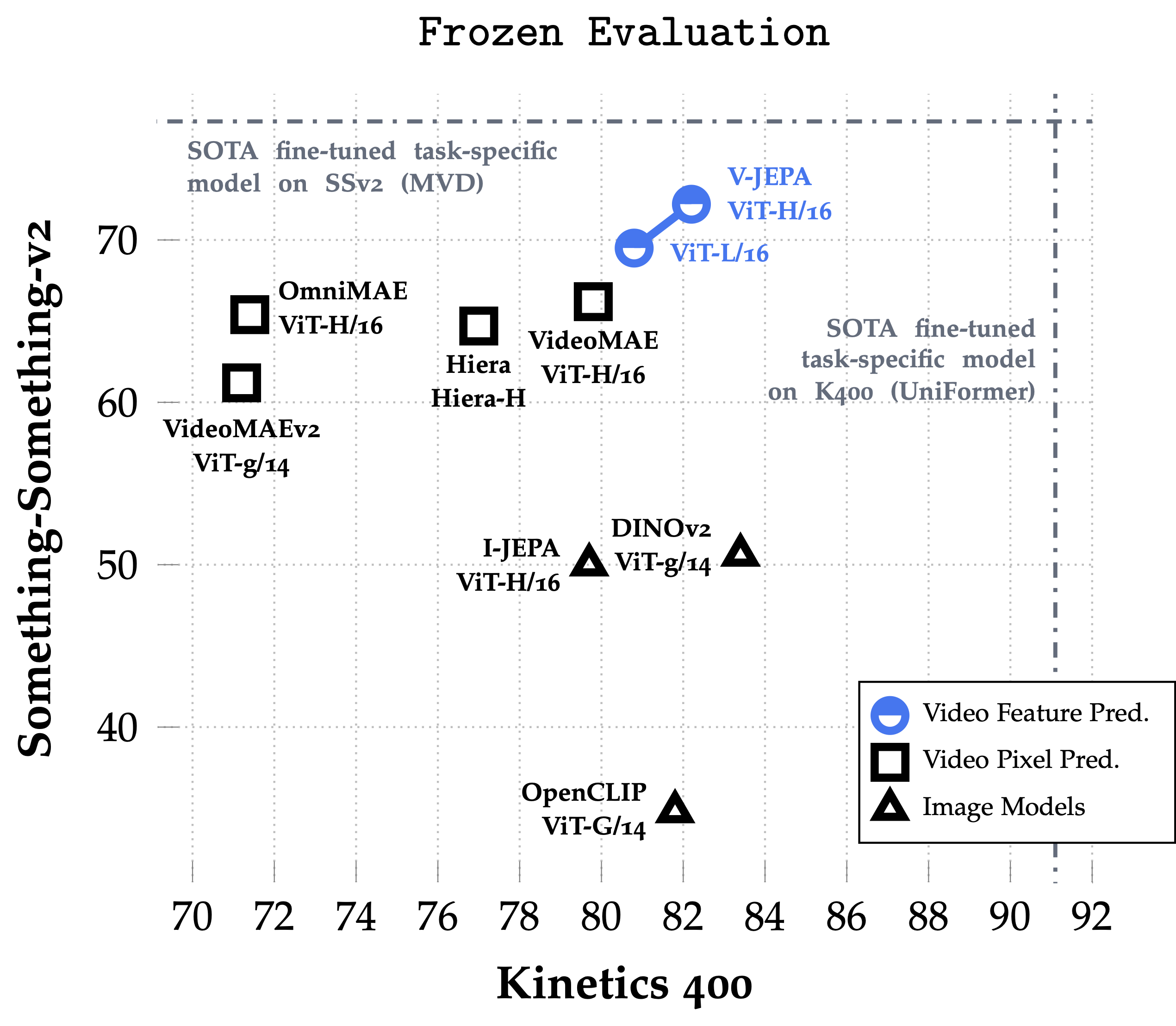 V-JEPA 预训练仅基于无监督特征预测目标(unsupervised feature prediction objective),不利用预训练的图像编码器(pretrained image encoders)、文本、负样本(negative examples)、人工标注或像素级重建(pixel-level reconstruction)。