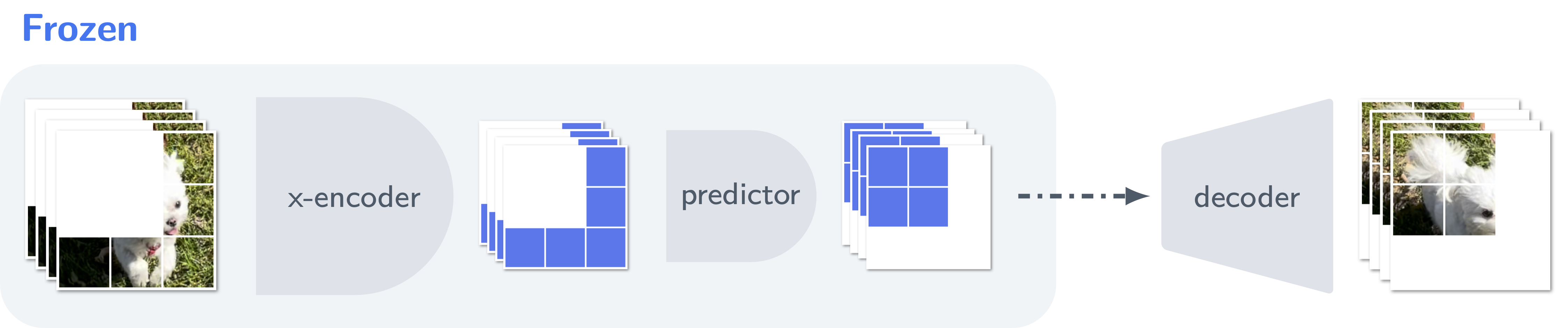 与具有像素解码器(pixel decoder)的生成式方法(generative methods)不同,V-JEPA 拥有一个在潜在空间(latent space)中进行预测的预测器(predictor)。 我们训练一个条件扩散模型(conditional diffusion model)将 V-JEPA 特征空间(feature-space)的预测解码为可解释的像素;在此过程中,预训练的 V-JEPA 编码器和预测器网络保持冻结。 该解码器仅接收针对视频中缺失区域预测的表示,无法访问未掩码(unmasked)的视频区域。