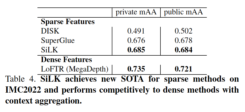 以下结果是使用我们的 VGG-4 主干网络计算得出的(表 2、3、6 使用检查点 pvgg-4.ckpt,表 4、5 使用 coco-rgb-aug)。为了复现 IMC2022 的结果,我们还提供了 Kaggle 笔记本。