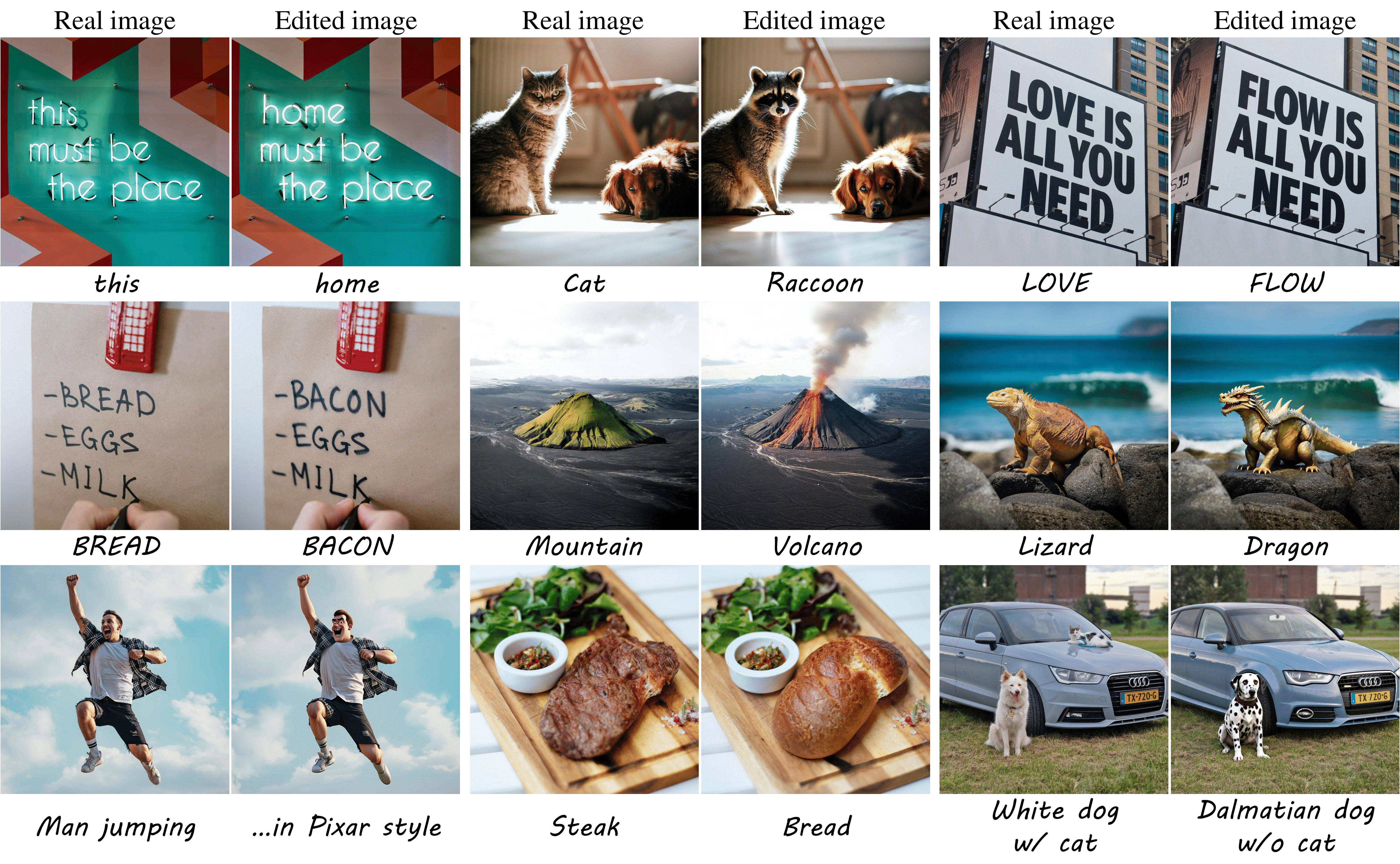 example_images文件夹。创建一个 edits 文件,指定:(a) 输入图片的路径,(b) 源提示词,(c) 目标提示词,以及 (d) 目标代码。目标代码总结了源提示词和目标提示词之间的变化,并会显示在输出文件名中。