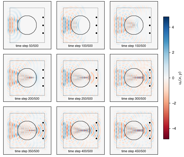 WaveRNN- 一个封装器,包含一个或多个WaveSource模块、零个或多个WaveProbe模块,以及一个WaveCell模块。WaveRNN模块是对各个组件的便捷封装,并负责对波动方程进行时间步进求解。如果没有探针(probe),WaveRNN的输出是随时间变化的标量场分布;如果存在探针,则默认输出为探针处的值,但也可以覆盖此行为以输出整个场分布。