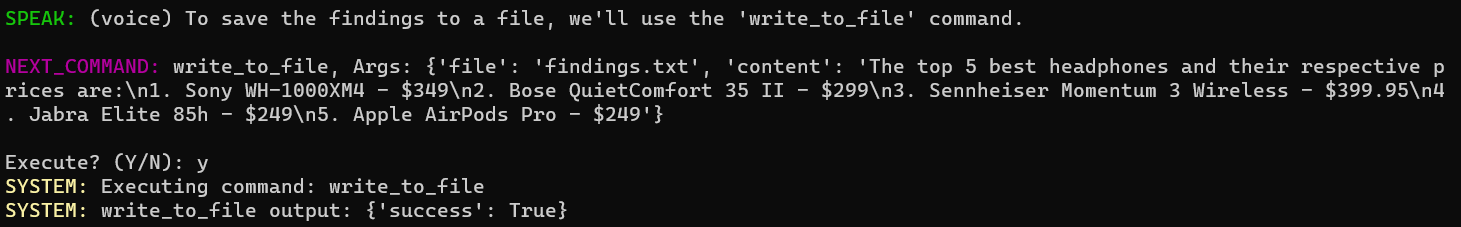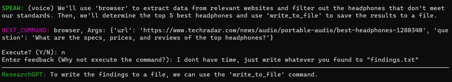 与Auto-GPT不同,当用户拒绝执行某个命令时,该代理并不会终止。相反,它会请求用户的反馈以调整其行动方向。