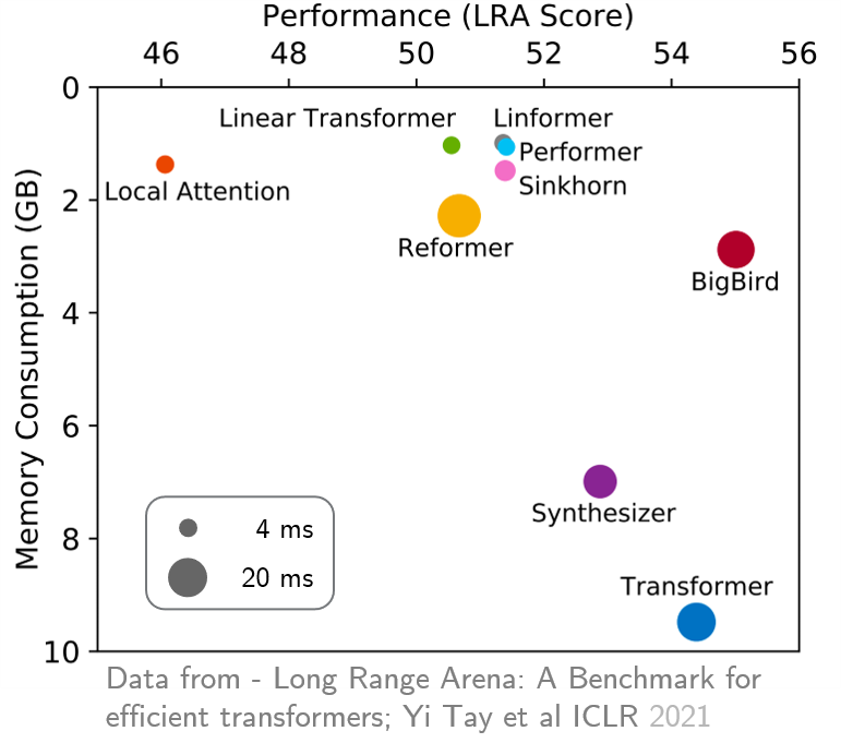 最近,Long Range Arena 提供了一个包含六个需要较长上下文的任务的基准测试,并对现有的所有长距离 Transformer 模型进行了实验比较。结果如下所示。与其他模型相比,BigBird 模型在不牺牲性能的情况下显著降低了内存消耗。