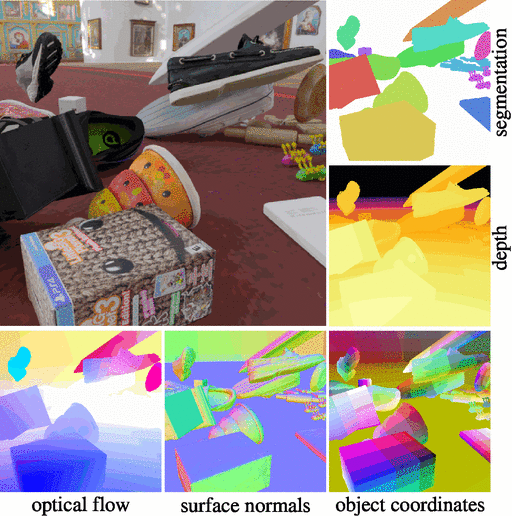 一个用于生成半真实感合成多物体视频的数据流水线,附带丰富的标注信息,如实例分割掩码、深度图和光流。