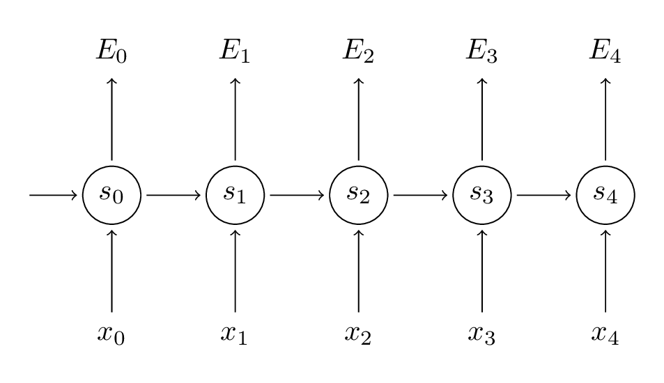 其中y_t是时间步t的真实标签,y^_t是我们预测的值。通常我们会把整个序列(句子)当作一个训练样本,因此总误差就是各个时间步(单词)误差的总和。