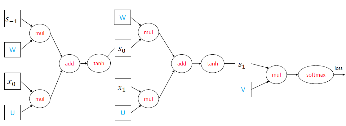 现在我们以E1为例,用计算图来表示,并计算dE1/dW和dE1/dU,思路是一样的。