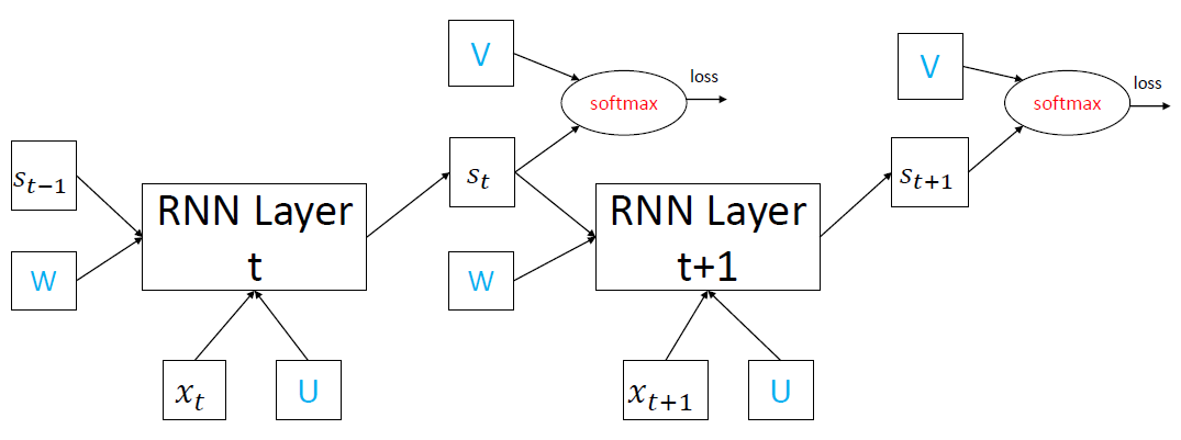 可以看到,参数(W, U, V)在不同时间步之间是共享的。每个时间步的输出可以经过softmax处理。因此,我们可以使用交叉熵损失作为误差函数,并采用优化算法(如梯度下降法)来求解最优参数(W, U, V)。