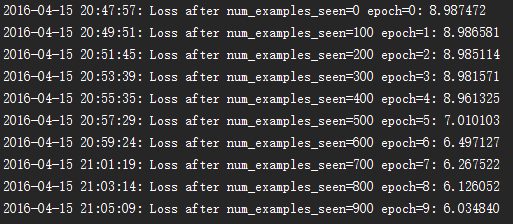 print("%s: Loss after num_examples_seen=%d epoch=%d: %f" % (time, num_examples_seen, epoch, loss))