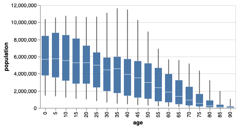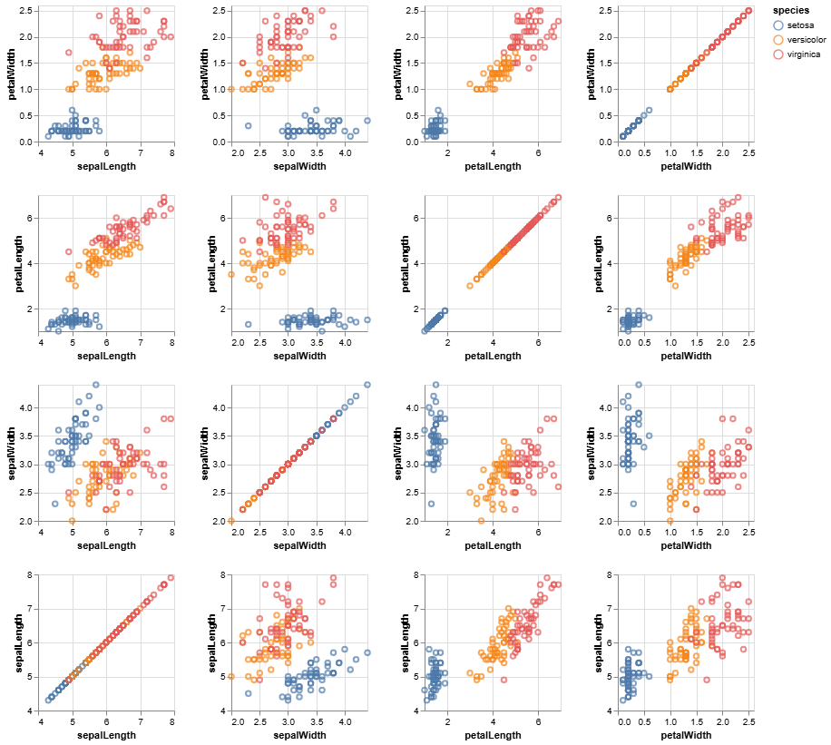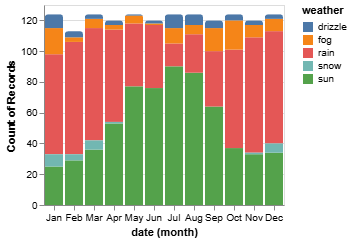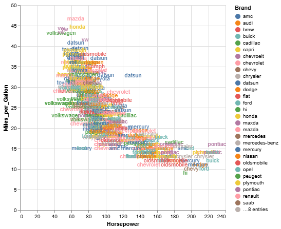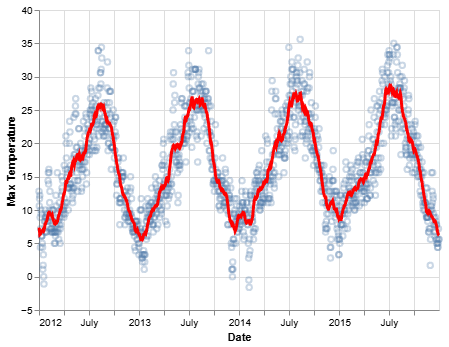 该库还支持声明式(declarative)方法的数据可视化。通过 smile.plot.vega 包,我们可以创建一个规范(specification),将可视化描述为从数据到图形标记(如点或条)属性的映射。该规范基于 Vega-Lite。在 Web 浏览器中,Vega-Lite 编译器会自动生成可视化组件,包括坐标轴、图例和比例尺。然后,它根据一组精心设计的规则确定这些组件的属性。