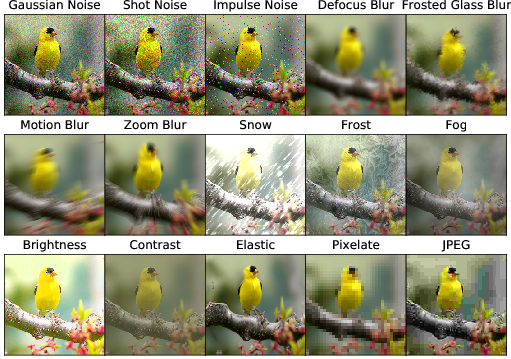 请务必查阅每篇论文中关于所有15种损坏效果的结果,因为有些技术能够提升对所有损坏的鲁棒性,而另一些方法则可能在某些损坏下有效、在其他情况下反而降低性能,还有一些方法特别擅长应对噪声类损坏。使用其他主干网络可能会获得更好的结果。例如,一个普通的ResNeXt-101模型的mCE为62.2%。需要注意的是,Lopes等人使用ResNet-50主干网络时,其mCE达到了80.6,因此他们的改进程度远超表格所显示的数值。