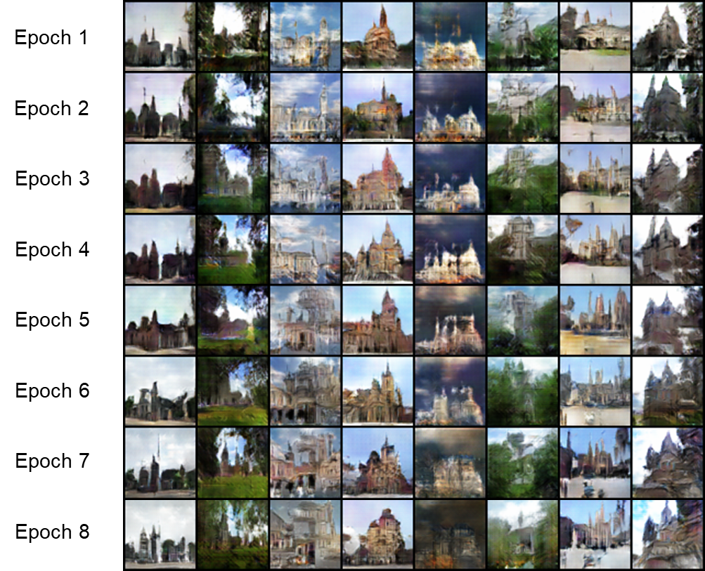 LSUN 教堂-户外场景数据集(左侧为当前轮次,仍在训练中)