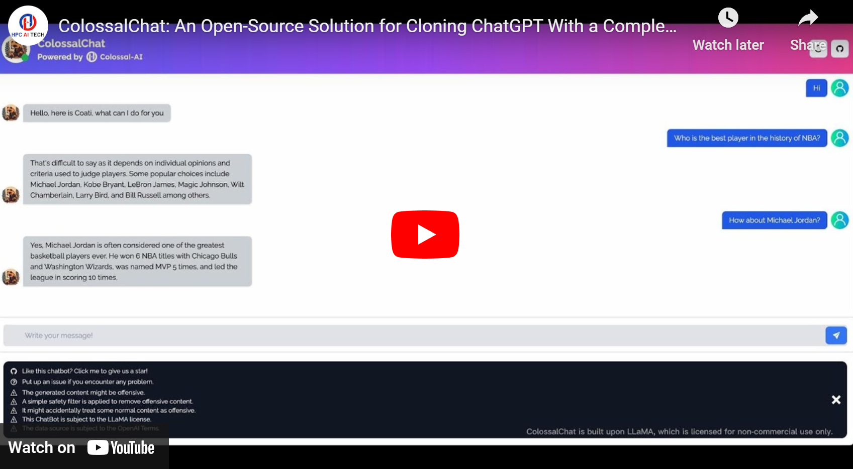 ColossalChat: 一个开源解决方案,用于克隆 ChatGPT,并配备完整的 RLHF 流程。 [代码] [博客] [演示] [教程]