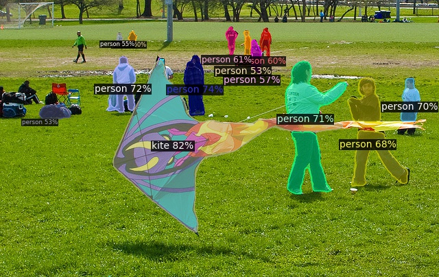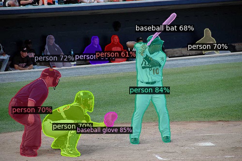 demo.py还支持对视频(--video-input)和摄像头(--webcam)进行推理。对于视频推理,您可以参考 issue #9 以避免一些错误。 --opts支持对配置文件的修改,例如INPUT.MIN_SIZE_TEST 512。--input可以是单张图片或一个包含多张图片的文件夹,例如xxx/*。- 如果未指定