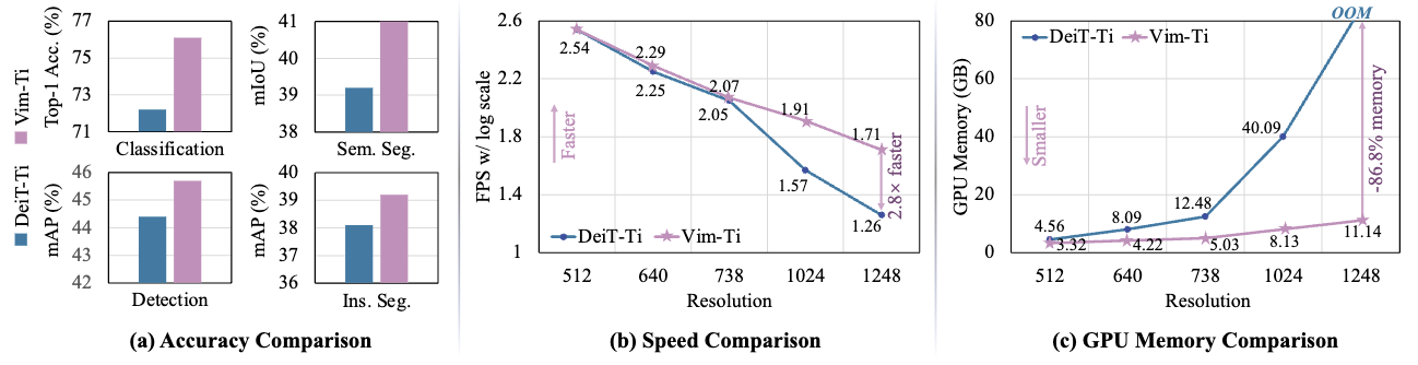 长期以来,视觉任务依赖自注意力机制来捕捉全局上下文,但这在高分辨率场景下效率较低。Vim 创新性地证明了无需自注意力也能实现优秀的视觉效果。它引入了双向状态空间模型(Bidirectional SSM),结合位置编码,能够以极低的资源消耗压缩并理解视觉数据。实验显示,在 ImageNet 分类、COCO 目标检测等任务中,Vim 的性能优于主流的 DeiT 模型,同时在推理速度上提升 2.8 倍,显存节省高达 86.8%。