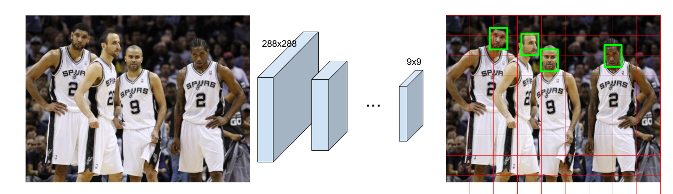 基于 YOLO 的自定义全卷积神经网络(FCNN, Fully Convolutional Neural Network)。接收一张 288x288 的 RGB 图像,并输出一个 9x9 的网格,每个网格单元可预测边界框(bounding box)及其中包含人脸的概率。