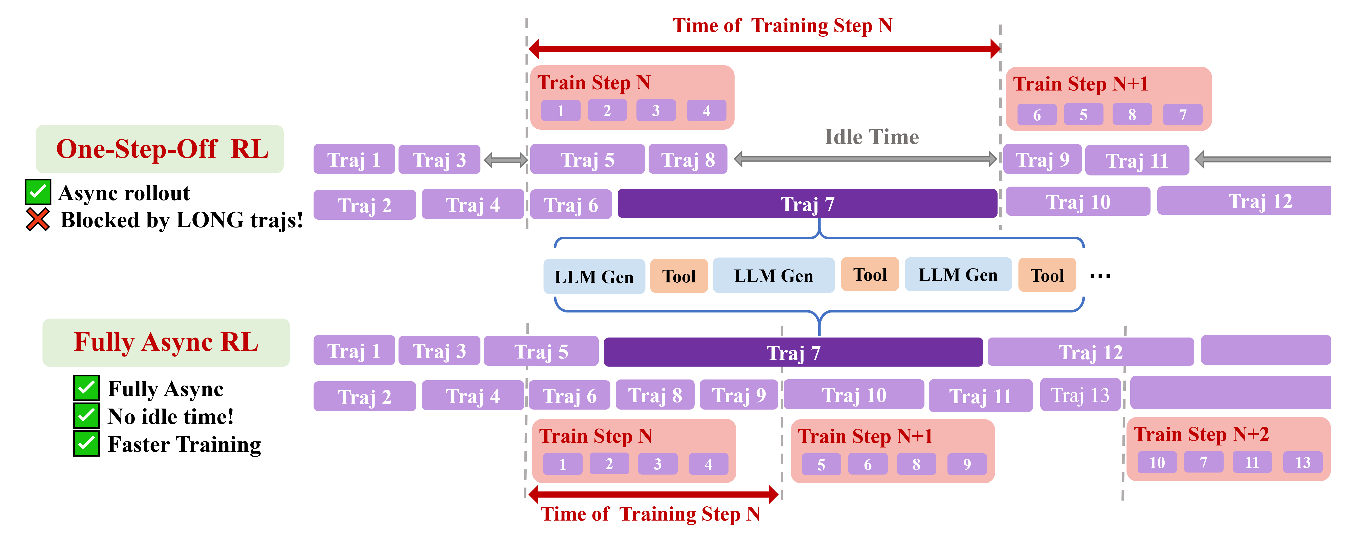 - ⚡ 全异步代理式强化学习:我们的可扩展代理式 RL 框架将轨迹收集与模型训练解耦,消除了 GPU 的空闲时间,实现了高效的长 horizon 强化学习训练。