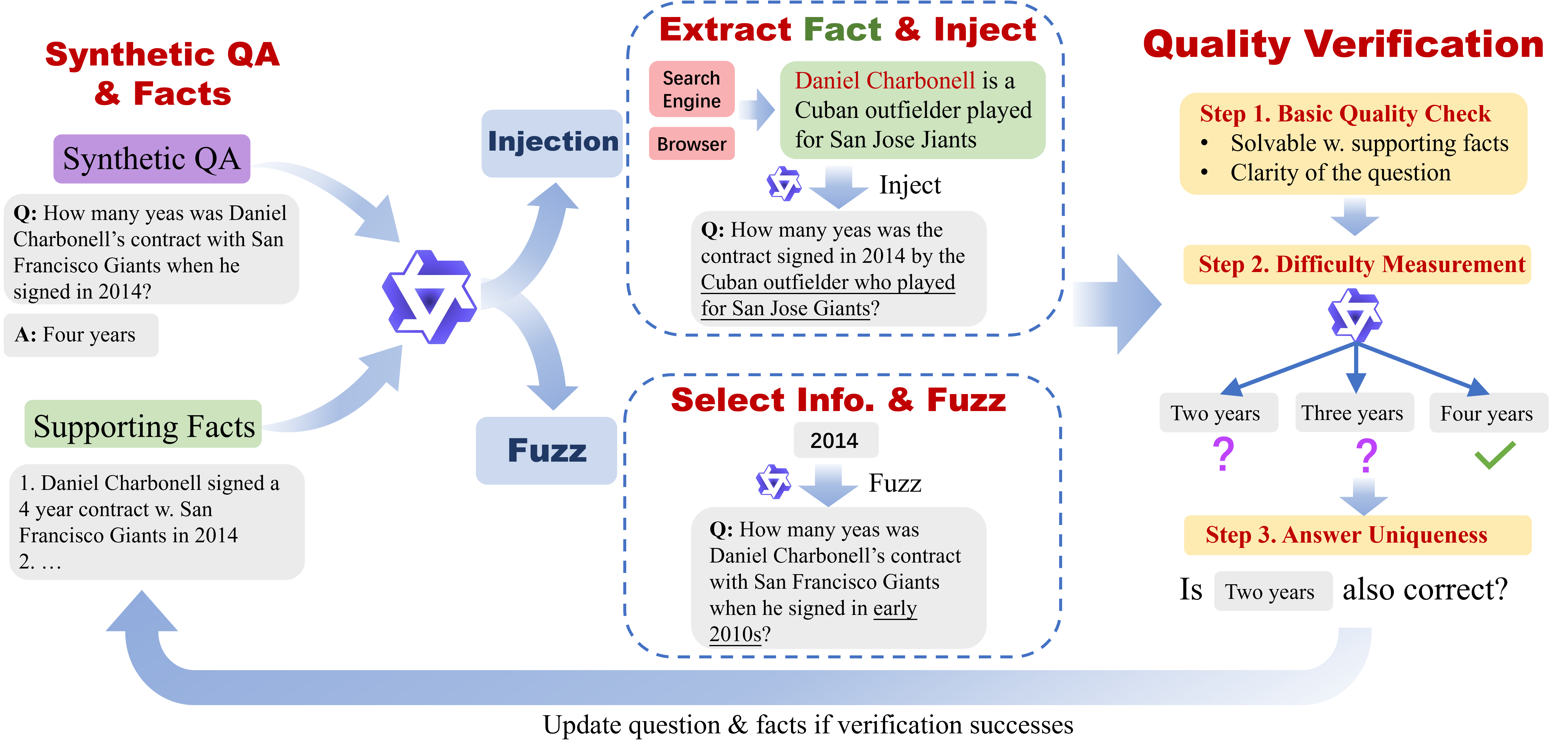 - 🔁 数据合成代理:我们引入了一种基于提示的 LLM 代理,能够自主生成有据可依、具有挑战性且高度不确定的问答对,从而提升训练多样性。