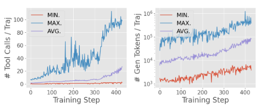 我们的分析揭示了智能体轨迹执行时间存在显著差异。通过考察强化学习训练过程中每条轨迹的回合数和生成的标记数量,我们发现较长的轨迹可能比短轨迹多出数十个回合。在标记生成方面,较长轨迹的生成量甚至可以达到较短轨迹的两 orders of magnitude,如下图所示。