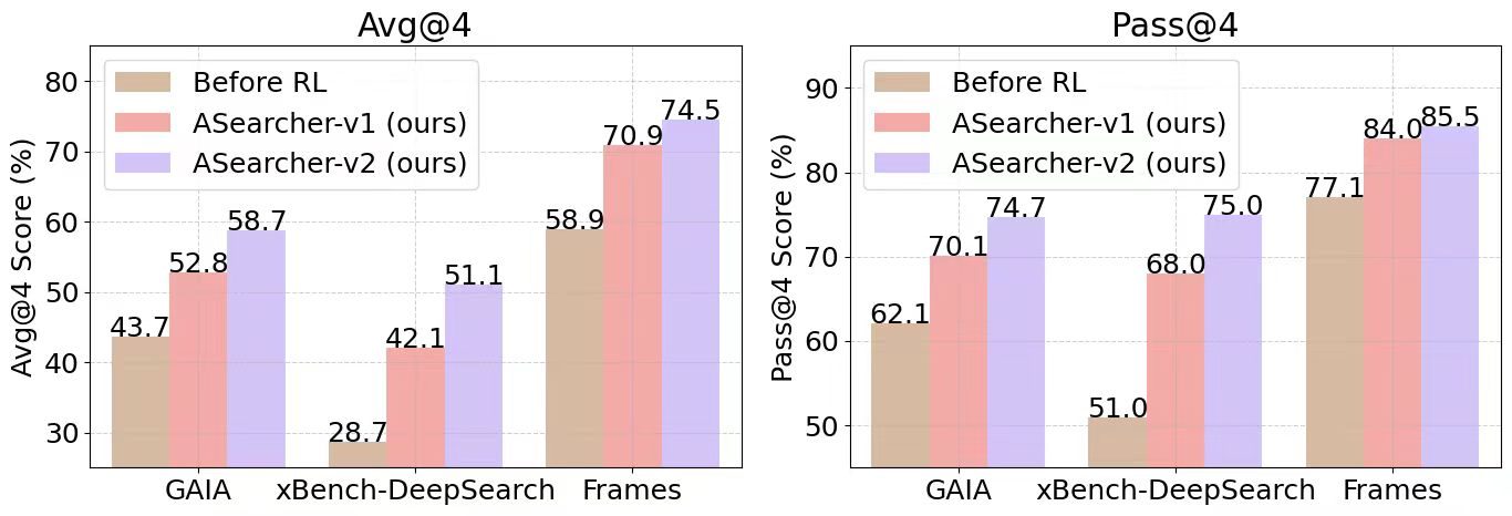 - 📈 通过 RL 实现显著提升:强化学习训练使 ASearcher 在 GAIA、xBench-DeepSearch 和 Frames 上的 Avg@4 分数分别提升了 +15.0、+22.4 和 +14.6。