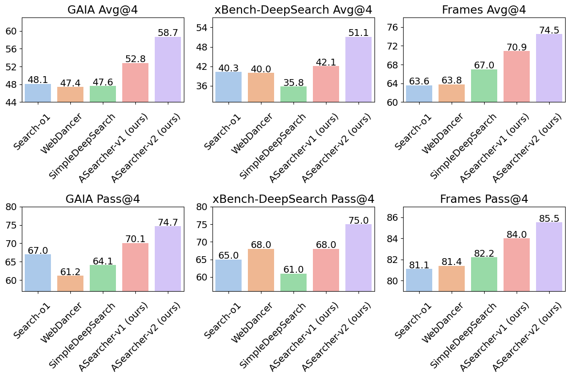 - 🏆 前沿性能:在简单的代理设计且不依赖外部 LLM 的情况下,ASearcher 在 GAIA、xBench-DeepSearch 和 Frames 上分别取得了 Avg@4 分数 58.7、51.1 和 74.5,超越了其他同为 32B 规模的开源搜索代理。ASearcher 在 GAIA、xBench-DeepSearch 和 Frames 上的 Pass@4 分数分别为 74.7、75.0 和 85.5。