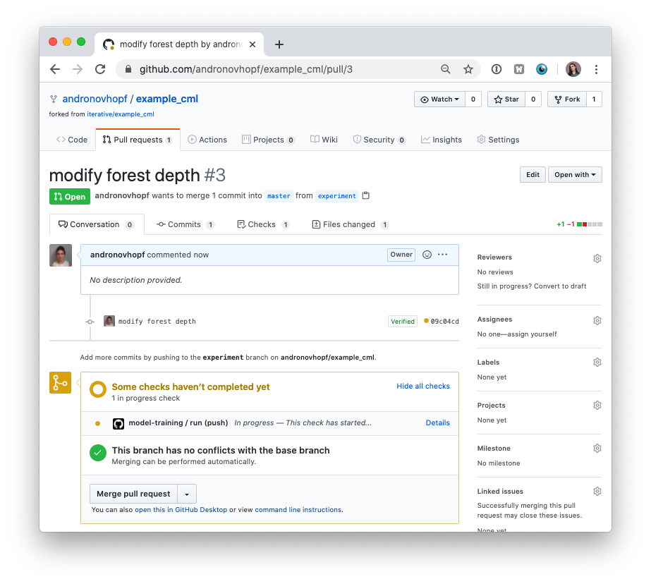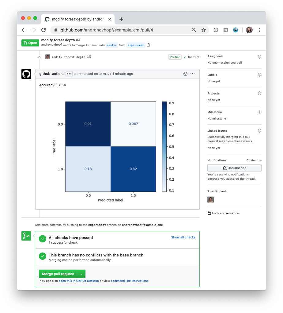 CML 可以帮助训练和评估模型——并在每次 pull request (拉取请求) 时自动生成包含结果和指标的可视化报告。