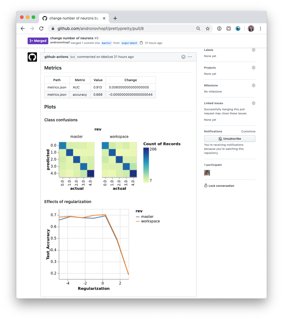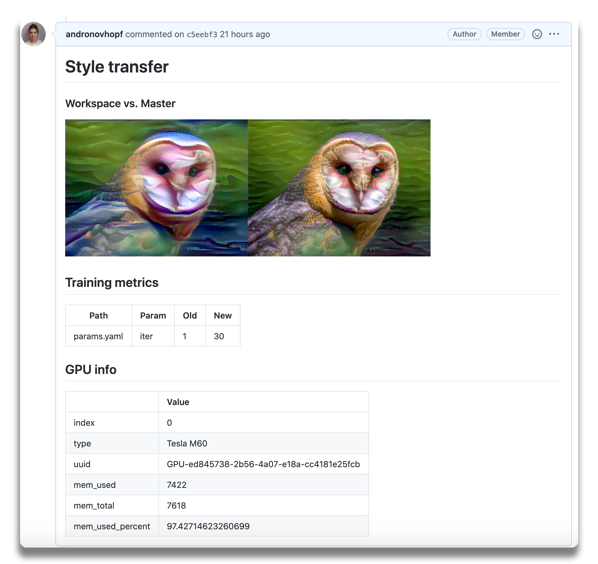 - ML 实验自动报告。 在每个 Git pull request 中自动生成带有指标和图表的报告。严谨的工程实践帮助您的团队做出明智的、数据驱动的决策。